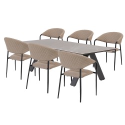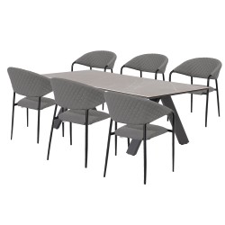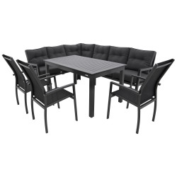 Tato luxusní souprava je vhodná pro každého, kdo hledá elegantní nábytek s mimořádnou odolností vůči nepřízni počasí. Sestava se skládá ze 6 polstrovaných křesel a velkého rozkládacího hliníkového stolu.