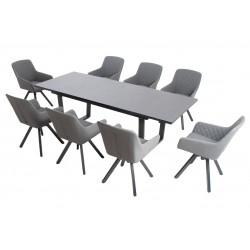 Tato luxusní souprava je vhodná pro každého, kdo hledá elegantní nábytek s mimořádnou odolností vůči nepřízni počasí. Sestava se skládá z 8 otočných křesel a velkého hliníkového rozkládacího stolu.