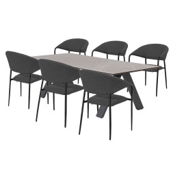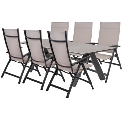 Tato luxusní souprava je vhodná pro každého, kdo hledá elegantní nábytek s mimořádnou odolností vůči nepřízni počasí. Sestava se skládá ze 6 polohovacích křesel a rozkládacího stolu o rozměrech 180/240 x 100 cm.