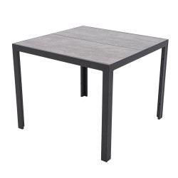 Praktický zahradní moderní stůl čtvercového tvaru. Jednoduché a čisté linie stolu jsou vhodné do každého prostředí. Celý stůl je vyroben z vysoce kvalitní hliníkové slitiny v antracitové barvě. Deska stolu je žebrovaná. Na nohách jsou regulační kolečka pro možné vyrovnání nerovností povrchu.