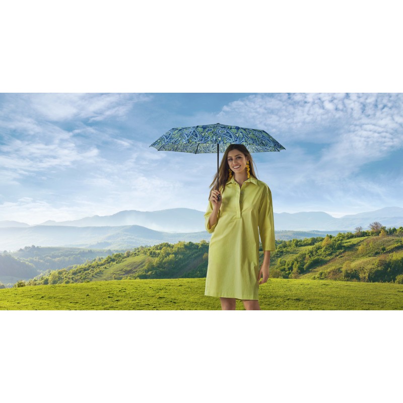 Kvalitní a elegantní dámský plně automatický deštník Fiber Magic Paisley blue s moderním vzorem.Kostra deštníku je vyrobena v kombinaci materiálů ocel / sklolaminát / hliník a zaručuje pevnost a stabilitu. Odolný proti korozi. Při otočení deštníku nedojde k jeho poškození.