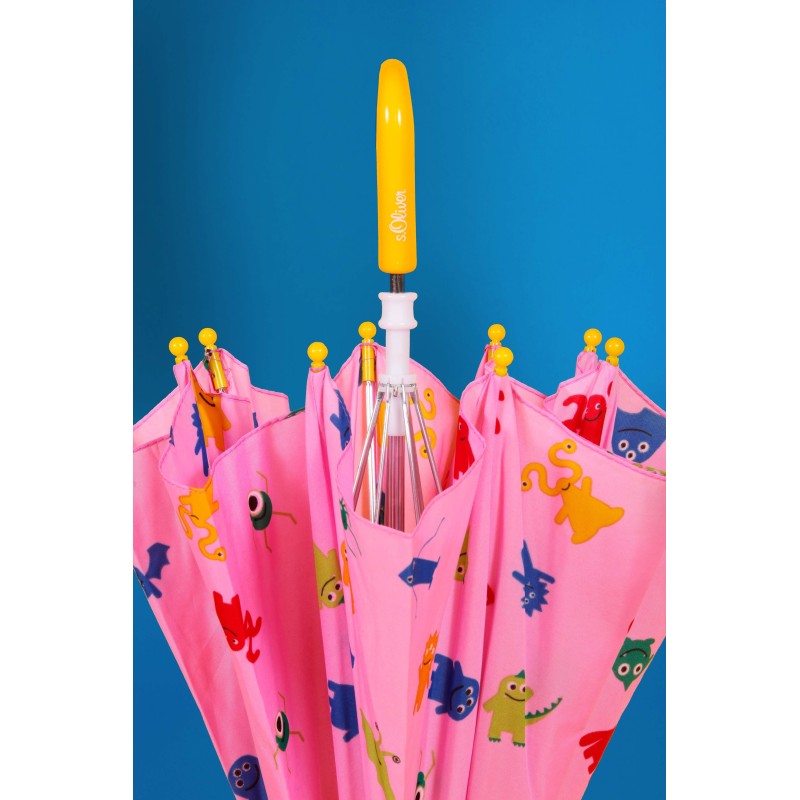 Dětský skládací deštník od trendy značky s.Oliver. S motivem monster růžový se žlutou rukojetí. Konstrukce ze ocele. Polyesterový potah je odolný proti změnám vlhkosti a teplot, nesráží se. Ochranné plastové koncovky.
