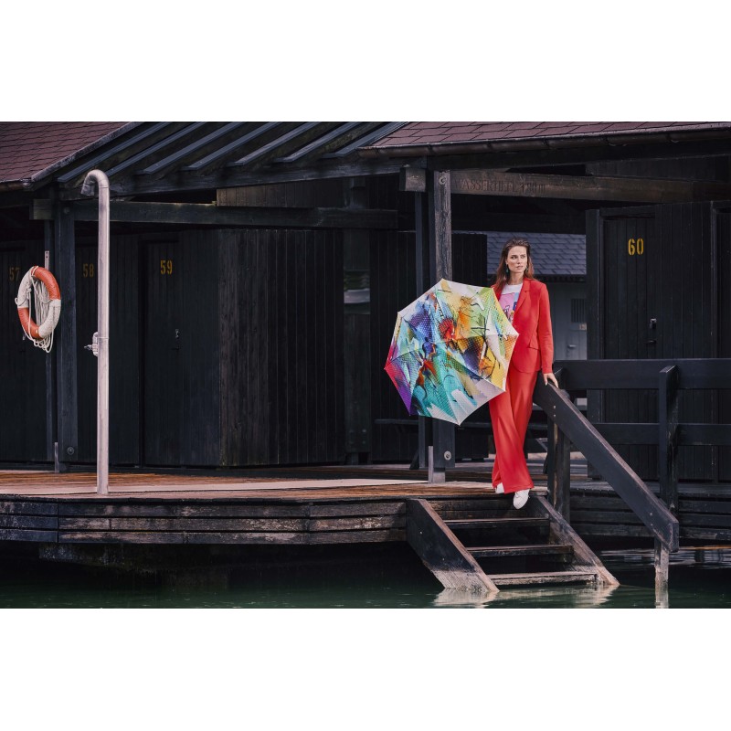 Exkluzivní luxusní dámský holový vystřelovací deštník z řady Doppler Manufaktur Boheme, který je ručně vyroben v Rakousku. Potah s abstraktním vzorem září pestrými barvami a zaujme na první pohled. Střecha deštníku je z vysoce kvalitní italské žakárové textilie, která je příjemná na dotek a vytváří jemné odlesky. Díky automatickému systému Doppler...