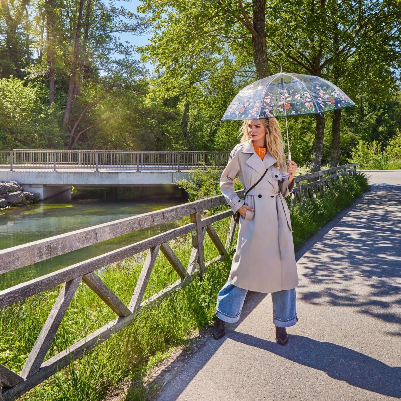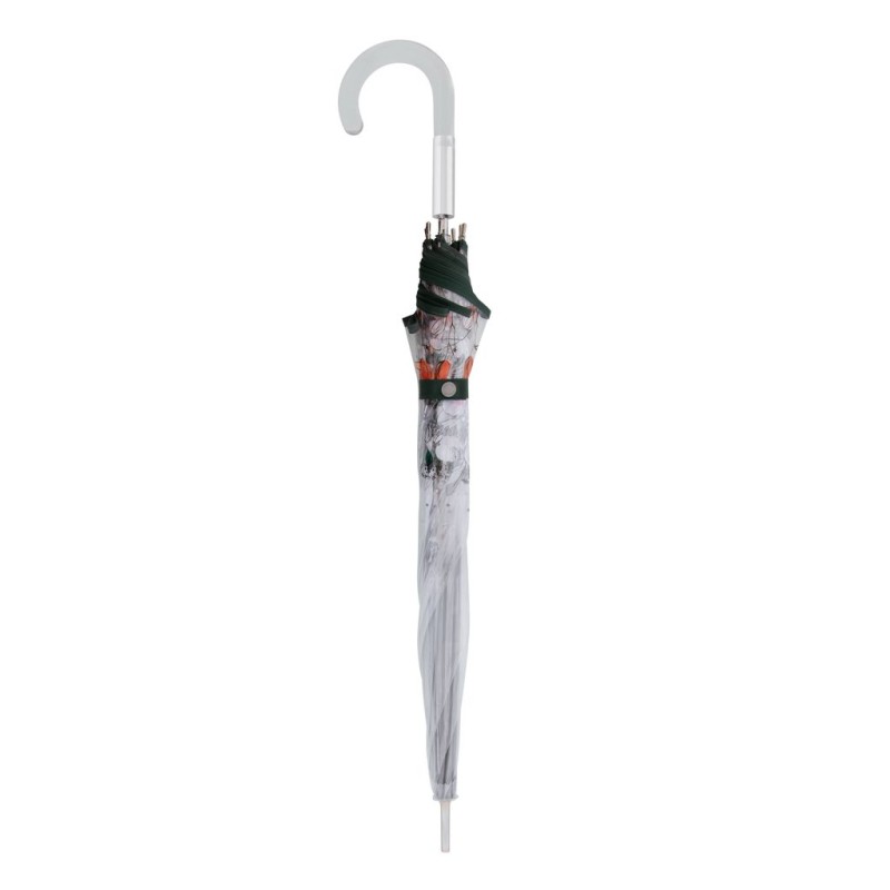 Fiber Long AC Transparent je dámský průhledný holový vystřelovací deštník, pod který se pohodlně vejdou i dvě osoby. Deštník má kvalitní konstrukci ze sklolaminátu a oceli, která jej také činí odolným vůči povětrnostním podmínkám - deštník byl testovaný ve větrném tunelu až do 100 km/hodinu. Průhledný potah je opatřený elegantním potiskem jenž vkusně ladí s průhlednou ručkou.