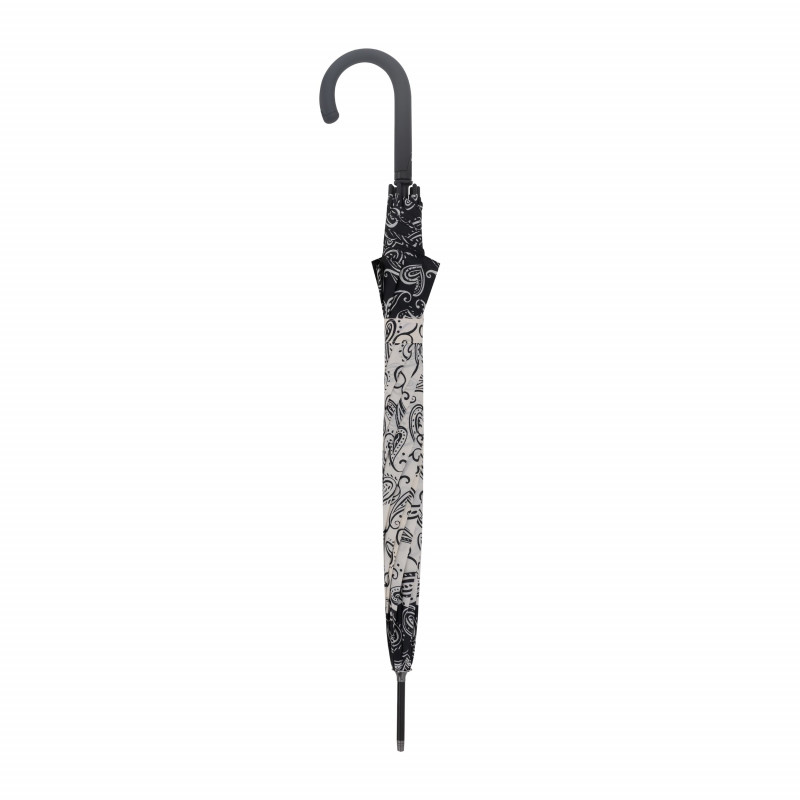 Stylový dámský holový deštník s originálním černo-bílým paisley vzorem zaujme na první pohled. Díky široké střeše poskytne pohodlnou ochranu i pro dvě osoby. Plastová rukojeť s logem doppler je ergonomicky tvarovaná a barevně sladěná s potahem. Konstrukce z oceli a sklolaminátu zajišťuje pružnost i odolnost proti převrácení větrem. Potah z rychleschnoucího polyesteru je odolný vůči vlhkosti a teplotním výkyvům a nesráží se.