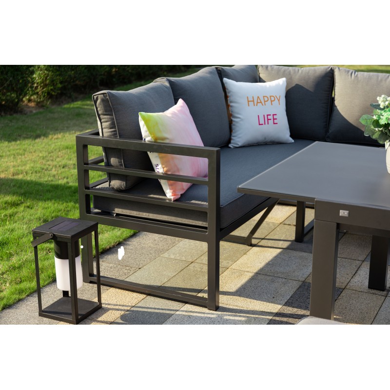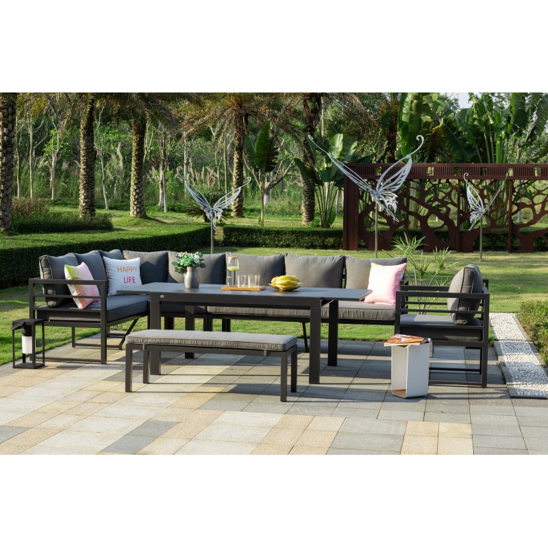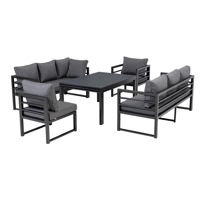 Luxusní zahradní sestava, která může být celoročně venku. Konstrukce je vyrobena z lehkého odolného a bezúdržbového hliníku. Sestava obsahuje 2 x 3 místnou pohovku, 1 x křeslo, 1 x lavice, 1 x rozkládací stůl. Díky funkci 3v1 si lze soupravu přizpůsobit podle potřeby. Ať už levá, pravá nebo 2 samostatné pohovky vám umožní maximálně využít dostupný prostor. Součástí jsou šedé nadýchané polstry, potahy jsou snímatelné (lze je prát) a jsou vyrobené z vysoce odolné textilie LIKA-TEX®.