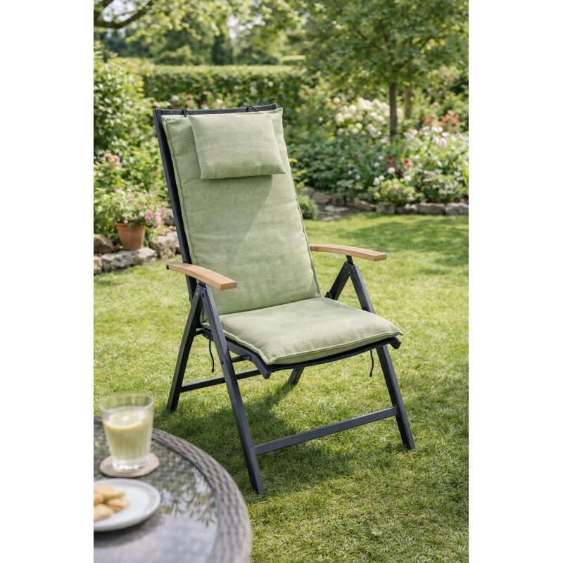 Polstr s vysokou opěrkou na zahradní nábytek je v provedení s obšitým lemem. Uchycení je pomocí posuvné spony. Díky sponě si můžete nastavit velikost dle rozměru a druhu židle, spona je pevná a nevytahuje se. Upevnění sedáku je pomocí dvou tkaniček v ohybu polstru. Síla polstru je optimální pro všechny druhy židlí. Provedení je vhodné i do náročných podmínek kaváren, zahrádek a restaurací. Polstr je v provedení se zipem, potah je snímatelný a je ho možno prát.