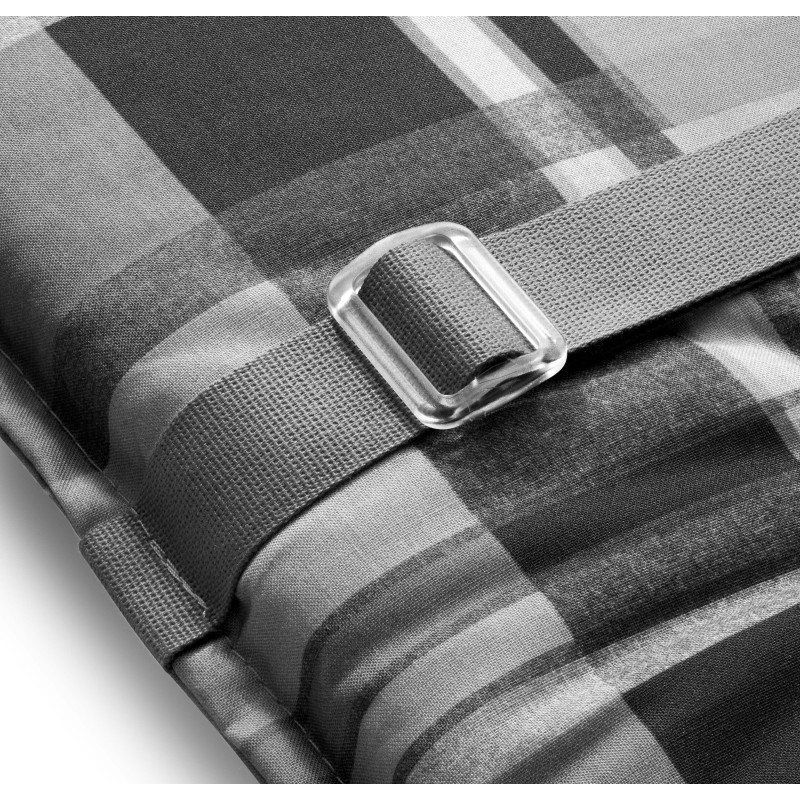Polstr s vysokou opěrkou na zahradní nábytek je v provedení s obšitým lemem. Uchycení je pomocí posuvné spony. Díky sponě si můžete nastavit velikost dle rozměru a druhu židle, spona je pevná a nevytahuje se. Upevnění sedáku je pomocí dvou tkaniček v ohybu polstru. Síla polstru je optimální pro všechny druhy židlí.