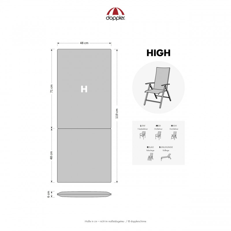 Polstr s vysokou opěrkou na zahradní nábytek řady LIVING je v provedení s obšitým lemem, prošitý kroužkově 4x v opěradle. Uchycení je pomocí posuvné spony. Díky sponě si můžete nastavit velikost dle rozměru a druhu židle, spona je pevná a nevytahuje se. Upevnění sedáku je pomocí dvou tkaniček v ohybu polstru. Síla polstru je optimální pro všechny druhy...