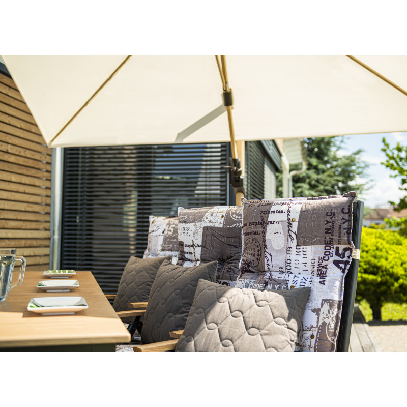 Polstr s vysokou opěrkou na zahradní nábytek řady LIVING je v provedení s obšitým lemem, prošitý kroužkově 4x v opěradle. Uchycení je pomocí posuvné spony. Díky sponě si můžete nastavit velikost dle rozměru a druhu židle, spona je pevná a nevytahuje se. Upevnění sedáku je pomocí dvou tkaniček v ohybu polstru. Síla polstru je optimální pro všechny druhy...