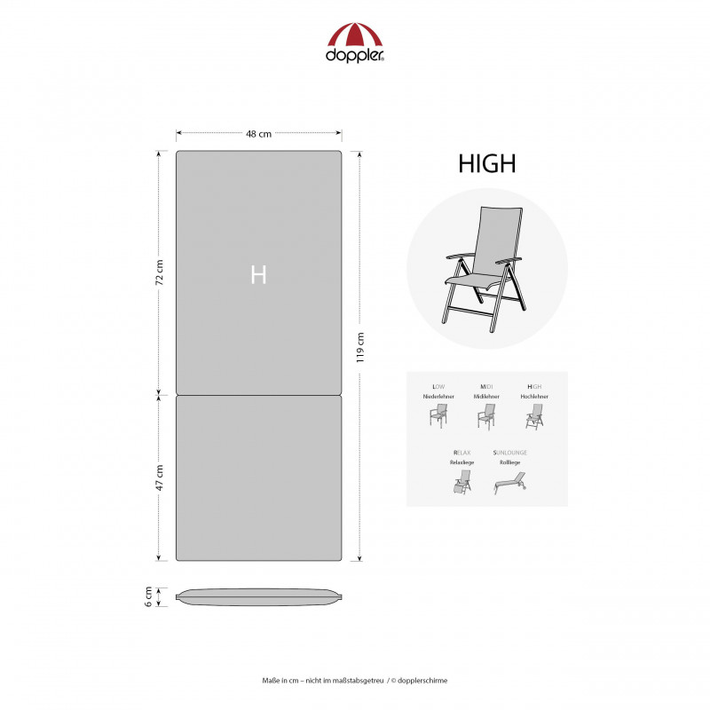 Polstr s vysokou opěrkou na zahradní nábytek řady ELEGANT je v provedení s obšitým lemem. Uchycení je pomocí posuvné spony. Díky sponě si můžete nastavit velikost dle rozměru a druhu židle, spona je pevná a nevytahuje se. Upevnění sedáku je pomocí dvou tkaniček v ohybu polstru. Síla polstru je optimální pro všechny druhy židlí. Provedení je vhodné i do náročných podmínek kaváren, zahrádek a restaurací. Polstr je v provedení se zipem, potah je snímatelný a je ho možno prát.