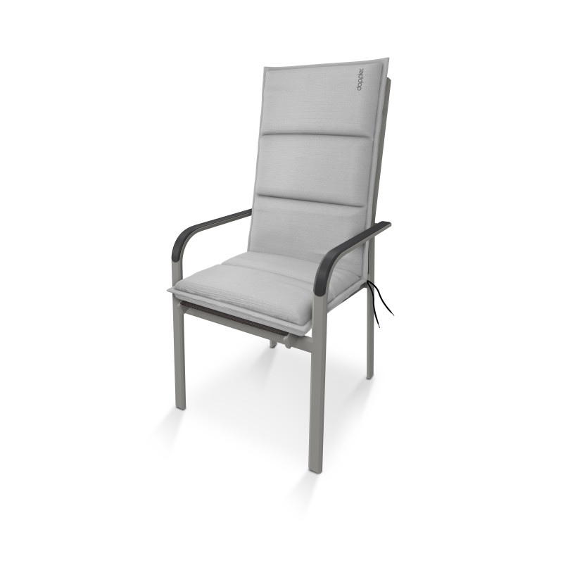 Polstr s vysokou opěrkou řady CITY. Elegantní polstr v módním odstínu, zdobený výšivkou Doppler na opěradle. Polstr je v provedení s obšitým lemem, prošitý 1x v sedáku, 2x v opěradle. Uchycení je pomocí posuvné spony. Díky sponě si můžete nastavit velikost dle rozměru a druhu židle, spona je pevná a nevytahuje se. Upevnění sedáku je pomocí dvou tkaniček v ohybu polstru. Síla polstru je optimální pro všechny druhy židlí. Provedení je vhodné i do náročných podmínek kaváren, zahrádek a restaurací. Potah je nesnímatelný.
