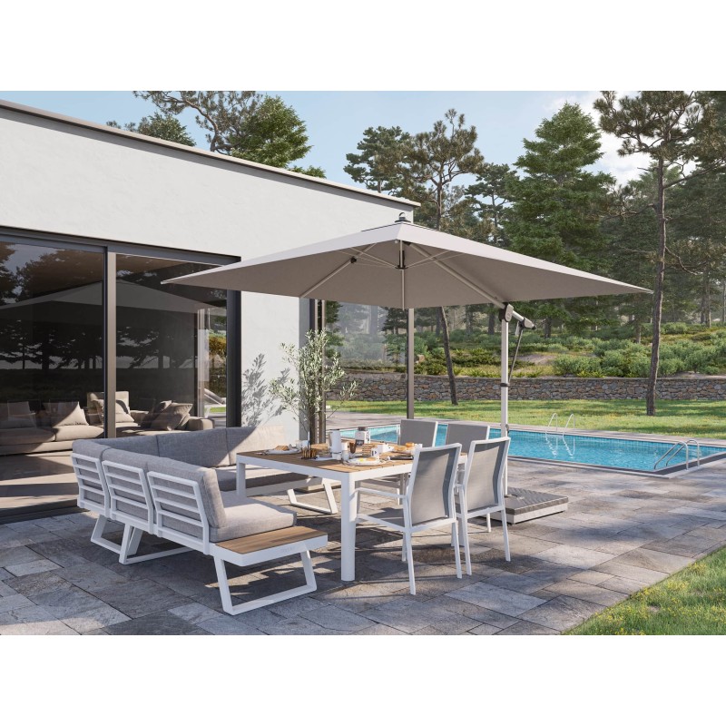 Tento multifunkční slunečník lze optimálně přizpůsobit poloze slunce díky své schopnosti o 360° a oboustrannému bočnímu naklápění střechy. Konstrukce je vyrobena z vysoce jakostního hliníku a všechny díly jsou šroubované. Slunečník má nově vyvinutý ozubený hnací řemen, ten zajišťuje dlouhotrvající a bezproblémový provoz při otevírání a zavírání slunečníku.