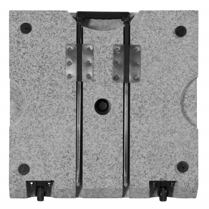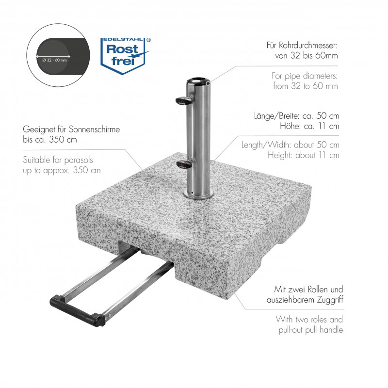 Vyrobený ze světle šedé žuly s 2 koly a rozšiřitelnou trolejovou rukojetí pro snadnou přepravu. Nerezová tyč má několik redukčních kroužků, které umožňují použití slunečníků s průměrem tyče 32–60 mm. Slunečník se kotví do tyče (trubka z nerezové oceli) pomocí dvou pojistných šroubů. Díky své hmotnosti 50 kg je zajištěna bezpečná stabilita i středně velkých středových slunečníků až do průměru 350 cm.
