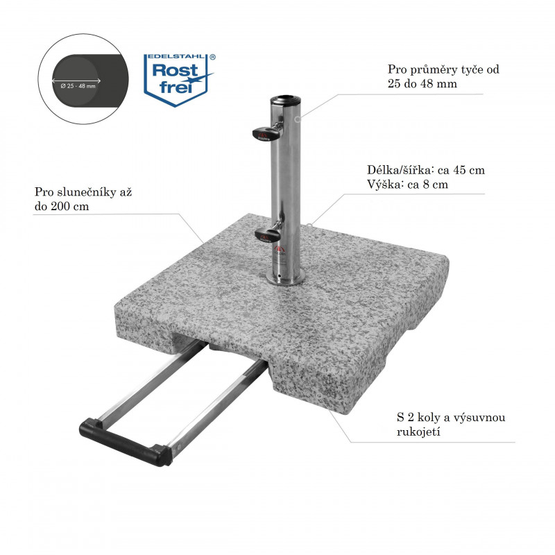 Vyroben ze světle šedé žuly s 2 koly a rozšiřitelnou trolejovou rukojetí. Vhodný pro snadnou přepravu. Nerezová tyč má několik redukčních kroužků a umožňuje použití průměrů slunečníku do max. 48 mm (od 25–48 mm). Slunečník se kotví do tyče (trubka z nerezové oceli) pomocí dvou pojistných šroubů. Žula je velmi odolná vůči povětrnostním vlivům a proto může být využitá celý rok.