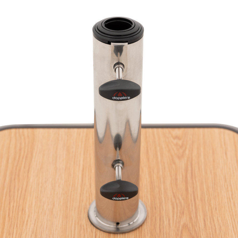 Zaoblené hrany podstavce zabraňují nebezpečí poranění. Rukojeť je možné snadno a prostorově úsporně uložit do základny. Slunečník lze do stojanu bezpečně ukotvit pomocí robustní nerezové trubky a dvou zajišťovacích šroubů.