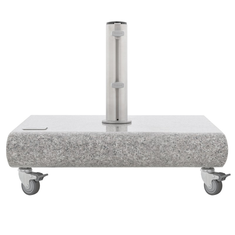 Tento prémiový pojízdný stojan značky Knirps je vyrobený z kvalitní světlé leštěné žuly a vyniká svým luxusním zpracováním. Je opatřený stojnou tyčí z nerezové oceli a dvěma zajišťovacími šrouby pro bezpečné ukotvení. Pro snadnější přesouvání je stojan navíc vybavený kolečky. Součástí balení jsou redukční kroužky včetně vložek, které jsou určené pro středové slunečníky s průměrem stojné tyče od 32 do 60 mm (vždy je nutné zohlednit velikost slunečníku a doporučené minimální zatížení každého modelu).