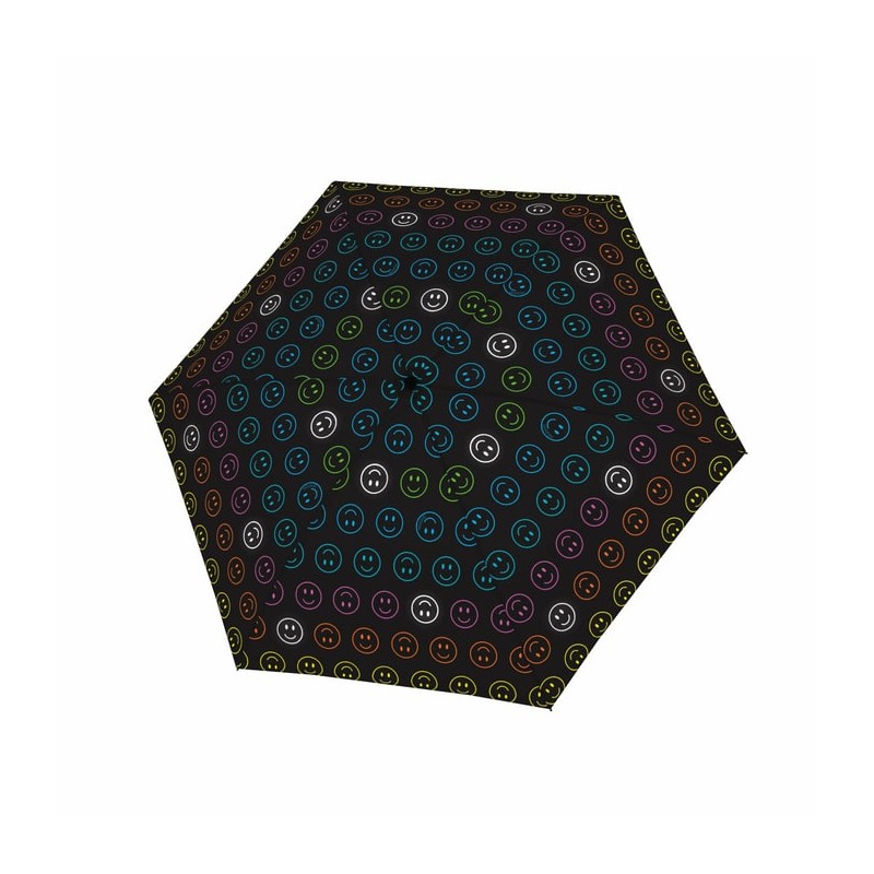 Manuální deštník s celohliníkovou konstrukcí, díky níž je deštník lehký, ale stále pevný. Černá střecha deštníku je poseta vtipnými, barevnými smajlíky. Bílý smajlíci jsou opatřeny reflexní povrchovou úpravou a zaručují viditelnost v mlze, soumraku nebo ve tmě. Deštník vhodný do kabelky i batohu. Poslední rameno ze sklolaminátu zajišťuje pružnost ve větru.