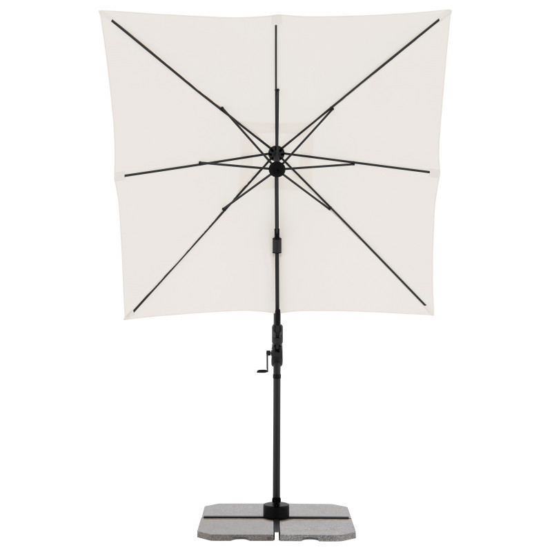 Slunečník má stabilní hliníkovou konstrukci, je vybaven klikovým mechanismem a je snadno ovladatelný. Potah slunečníku je vyroben z polyesterové tkaniny, je vodoodpudivý a má dobrou UV ochranu SPF 50+. Slunečník je otočný o 360 °, je možné ho naklápět v sedmi pozicích a axiálně natáčet na obě strany.