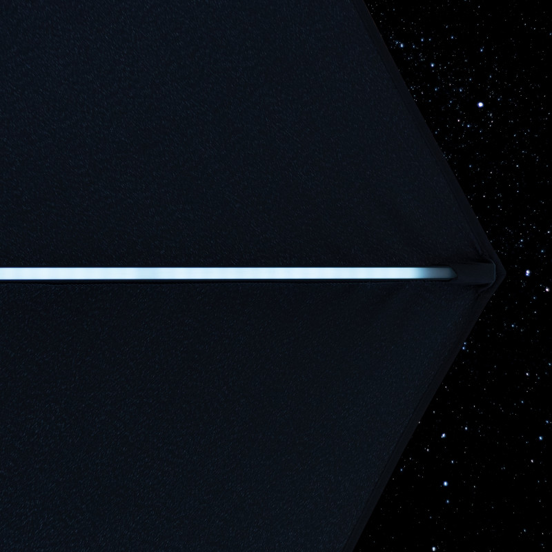 Tento krásný slunečník s velkou střechou s UV filtrem v elegantní antracitové barvě Vám poskytne dokonalou ochranu před slunečními paprsky na Vašem balkónu nebo zahradě a prodlouží Vaše letní večery díky integrovanému LED osvětlení v ramenech slunečníku. Nabíjení baterie máte vyřešené bez práce – probíhá automaticky pomocí solárního panelu. Navíc pro jistotu dostanete náhradní baterii a USB nabíječku jako bonus. Stabilní tyč slunečníku, vyrobená z masivního, pevného a lehkého hliníku, je vybavená klikou pro rychlé otevírání a zavírání. Tyto vlastnosti činí slunečník ACTIVE nenáročným na údržbu a můžete ho používat celé léto. Velkorysý průměr střechy slunečníku 3 m zaručuje dostatek místa k odpočinku v chladivém stínu. Díky ventilačnímu otvoru ve střeše se pod slunečníkem nekumuluje horký letní vzduch.