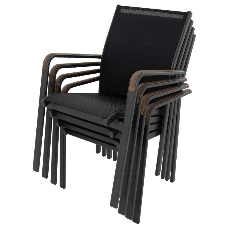 Dvě stohovatelná křesla Expert Wood Plus doplňují tuto sestavu svým moderním designem a praktickými vlastnostmi. Stabilní hliníková konstrukce v antracitové barvě je doplněna výpletem z kvalitní umělé textilie, která je odolná vůči vlhkosti, UV záření a povětrnostním vlivům. Stylový vzhled křesel podtrhují hliníkové područky s práškovým nástřikem v tónu tmavě hnědého dřeva, jejichž zaoblené konce přispívají k maximálnímu pohodlí. Praktická stohovatelnost křesel šetří prostor při skladování, a díky lehké konstrukci s nimi lze snadno manipulovat. Použité materiály jsou zcela bezúdržbové.