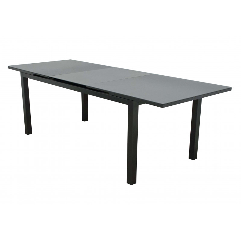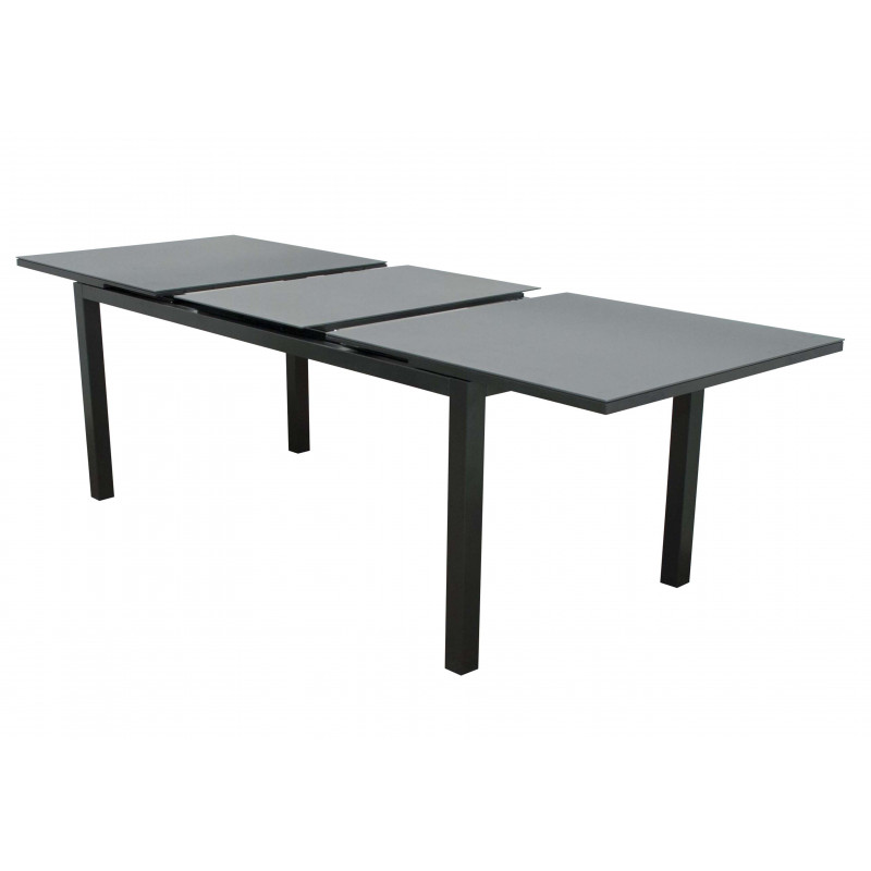 Stůl FIRENZE zaujme svým minimalistickým designem, který elegantně kombinuje hliníkovou konstrukci v antracitové barvě s deskou z odolného bezpečnostního tvrzeného skla v tmavě šedém odstínu. Skleněná deska o tloušťce 5 mm je strukturovaná, což účinně minimalizuje viditelnost otisků prstů a drobných škrábanců, a tím přispívá k nenáročné údržbě. Díky své robustní konstrukci je stůl stabilní a odolný vůči povětrnostním vlivům, což zajišťuje jeho dlouhou životnost i při celoročním používání.