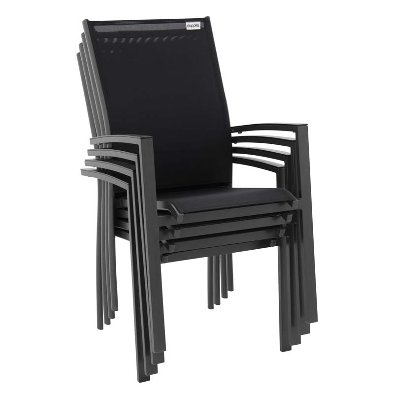Součástí sestavy jsou čtyři zahradní stohovatelná křesla EXPERT značky DOPPLER, která se vyznačují pevnou, ale lehkou hliníkovou konstrukcí v antracitové barvě a ergonomicky tvarovaným sedákem s výpletem z odolné umělé textilie v černé barvě. Křesla jsou navržena tak, aby poskytovala vysoký komfort při sezení, a díky možnosti stohování také šetří místo při uskladnění.