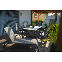 BERGAMO je moderní stůl ve velikosti cca 180 x 90 cm se stabilní hliníkovou konstrukcí, která je ošetřena práškovým nástřikem v antracitové barvě. Díky tomu je kov chráněn proti korozi a povětrnostním vlivům a tím se stává zahradním nábytkem s dlouhou životností.