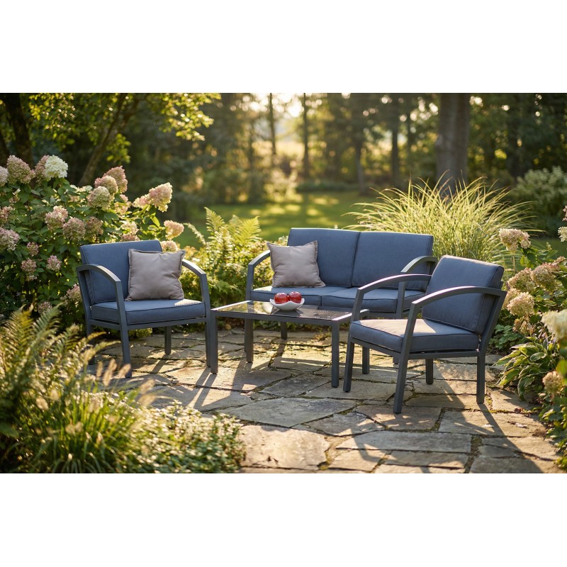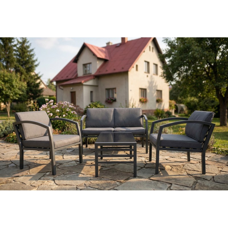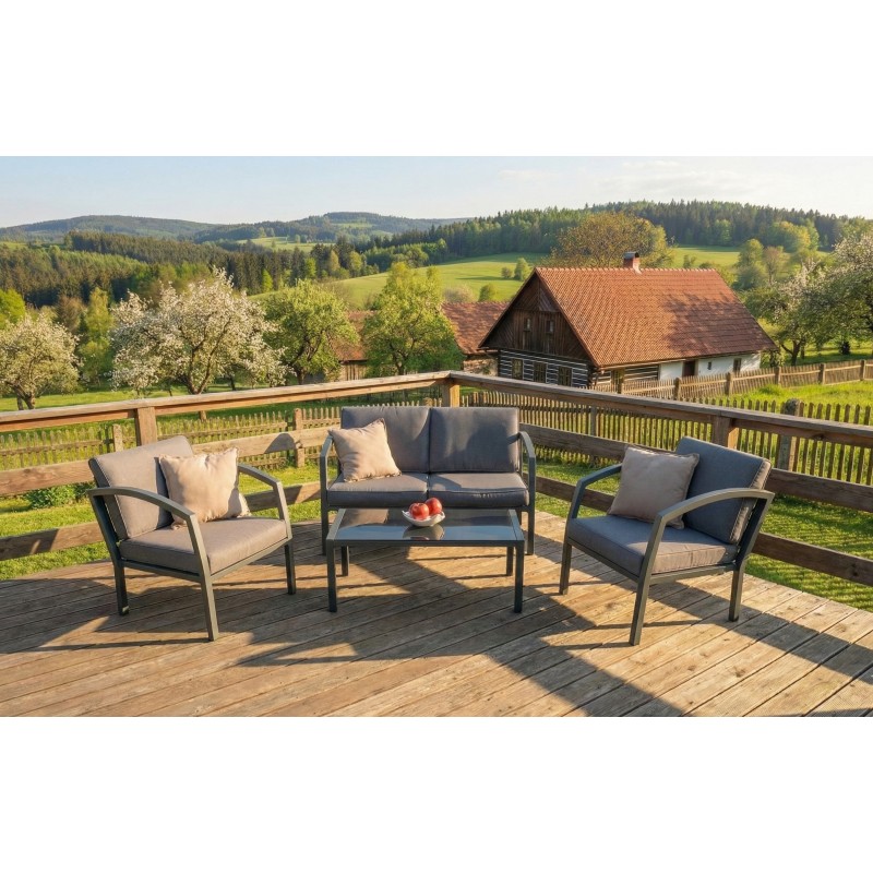 Kvalitní a stabilní hliníková konstrukce v antracitové barvě je kombinována s odolnými polyesterovými sedáky a nadýchanými opěrnými polštáři, které nabízí maximální pohodlí. Polstry jsou vybaveny zipy, což umožňuje je jednoduše vyjmout a vyprat. Set tvoří dvoumístná pohovka, dvě křesla a stolek se skleněnou deskou.