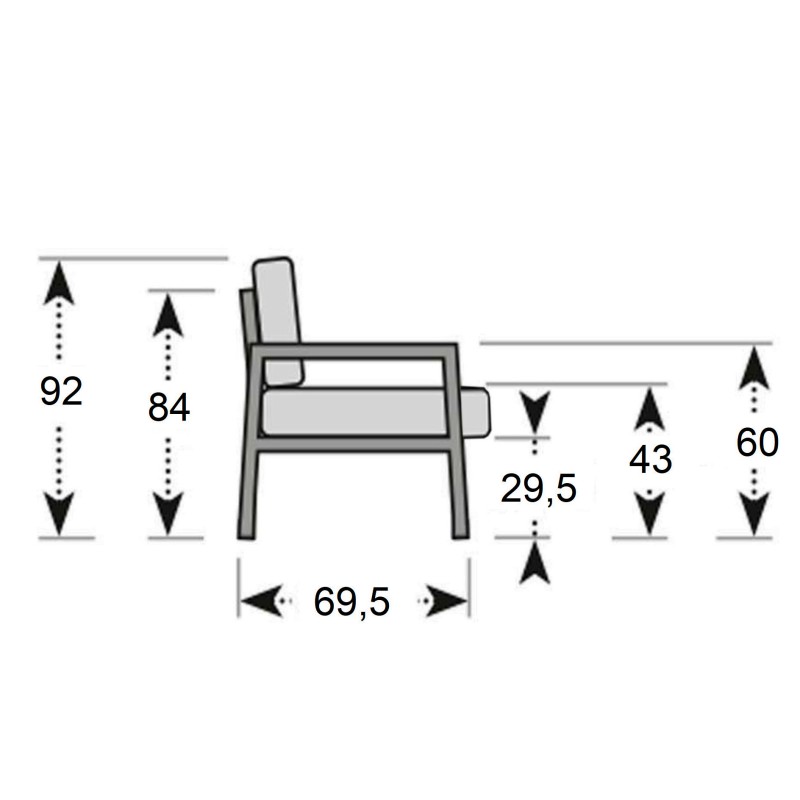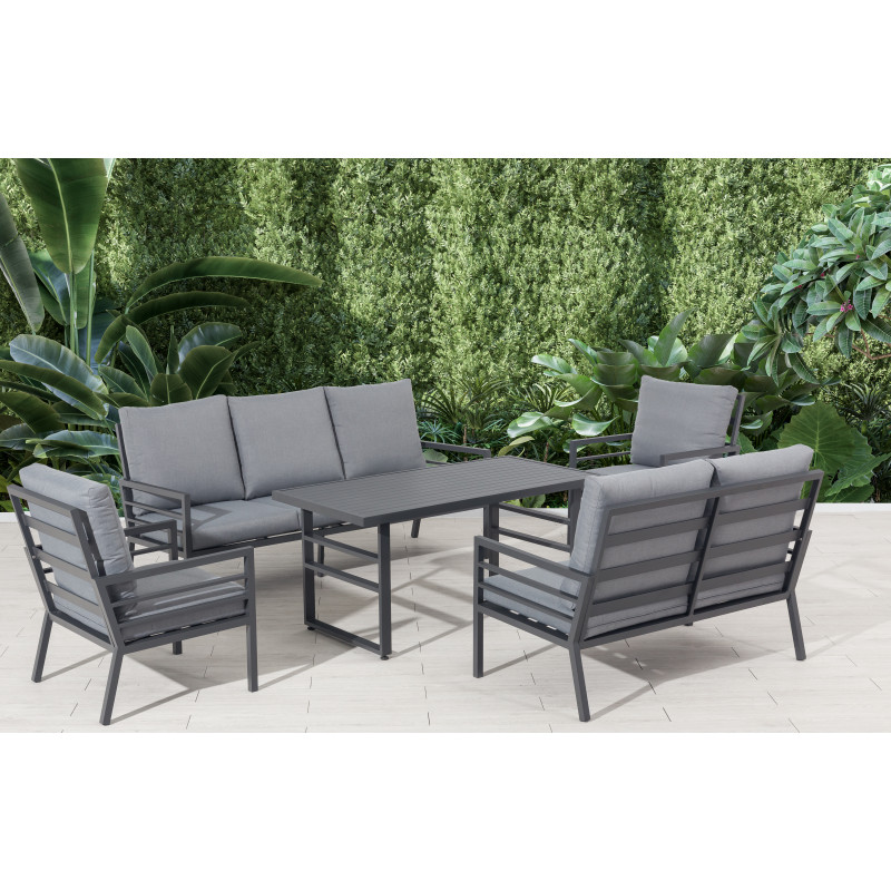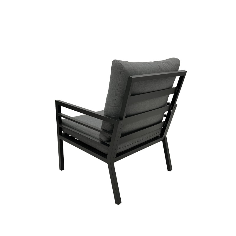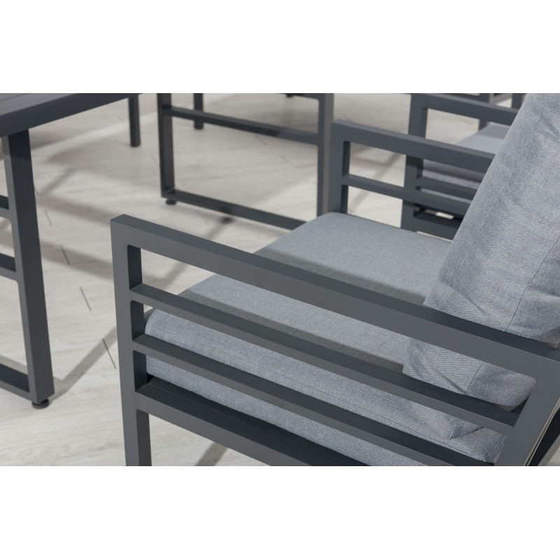 Konstrukce je vyrobena z lehkého, odolného a bezúdržbového hliníku s práškovým nástřikem v elegantní antracitové barvě. Součástí jsou šedé polstry o tloušťce 10 cm.