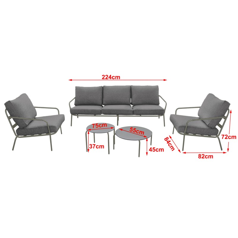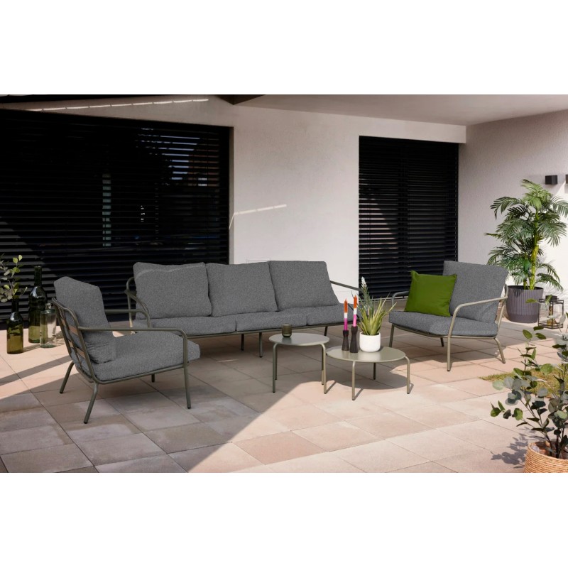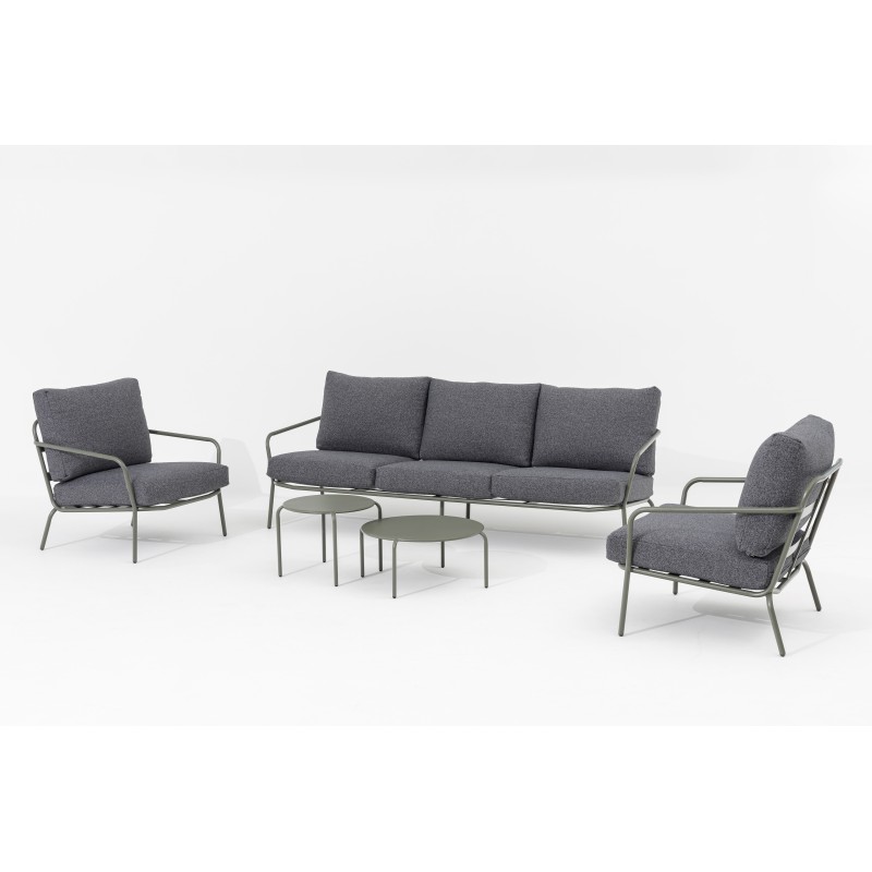 Calista Set vám poskytne prostornost a pohodlí, protože zahrnuje 3-místnou pohovku a dvě stylová křesla, což znamená, že máte dostatek místa pro všechny. Vysoké sedací a opěrné polštáře zajišťují, že se budete cítit jako v obýváku i na čerstvém vzduchu. Ocelová konstrukce v zelené barvě dodává soupravě moderní vzhled a stabilitu.