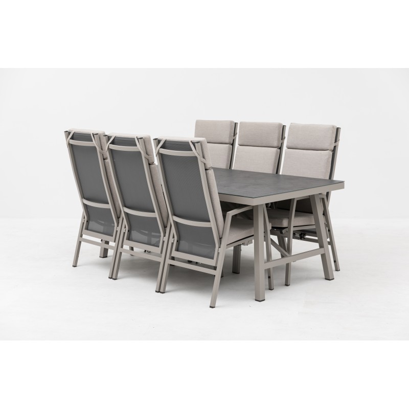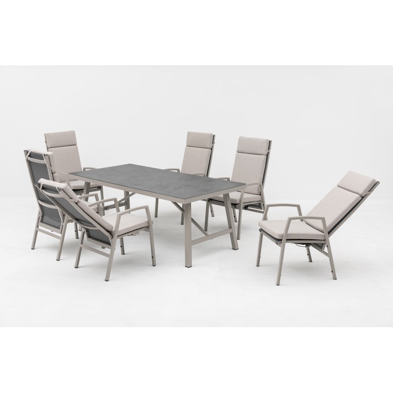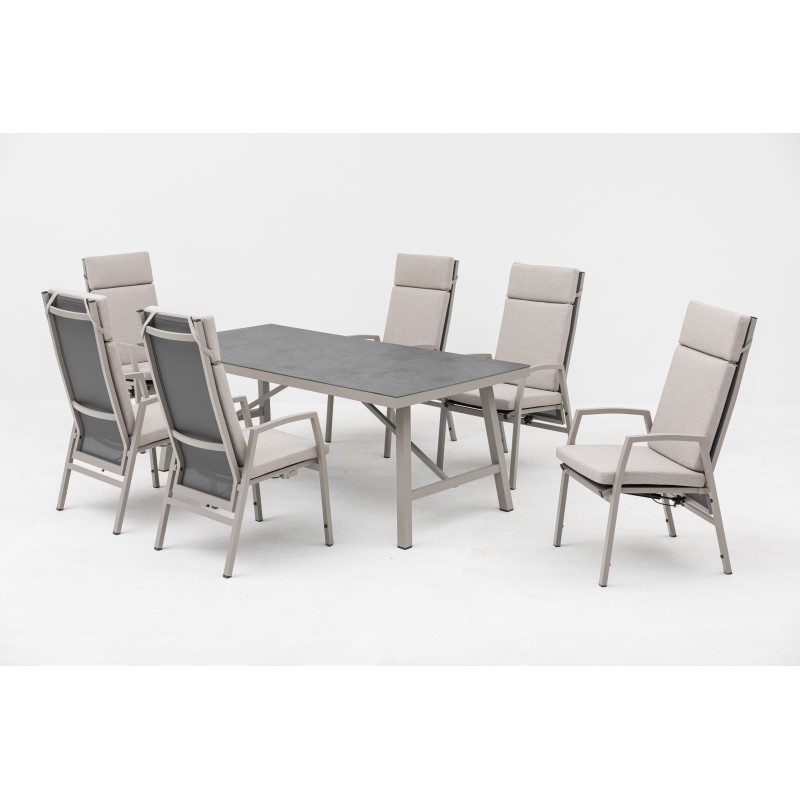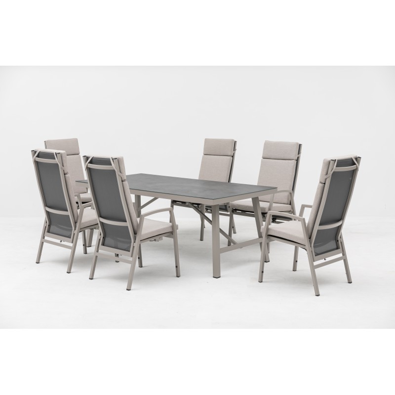 Tato 7-dílná sestava je vyrobena z lehké a odolné hliníkové konstrukce v moderní mocca barvě, která se snadno udržuje a dokonale odolává povětrnostním vlivům.