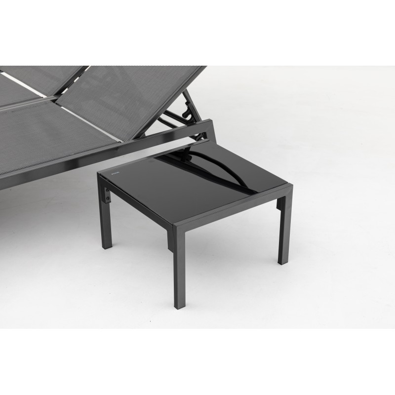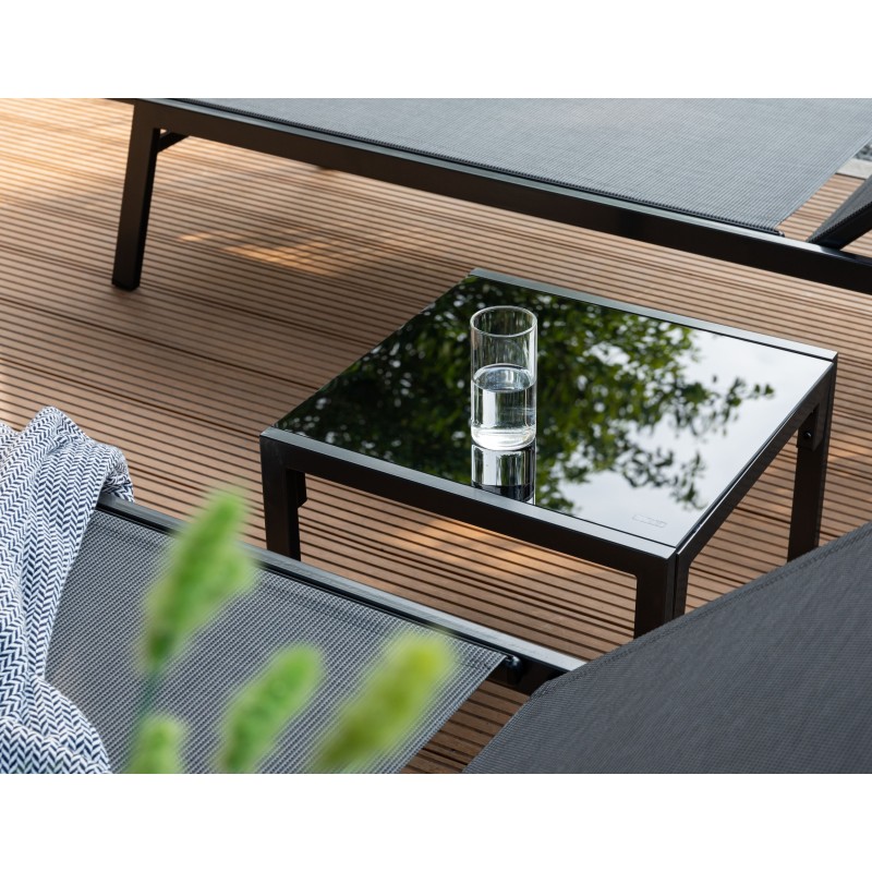 Součástí setu je také kompaktní odkládací stolek se skleněnou deskou, na který si můžete odložit knihu, nápoj nebo sluneční brýle – vše tak budete mít vždy po ruce.