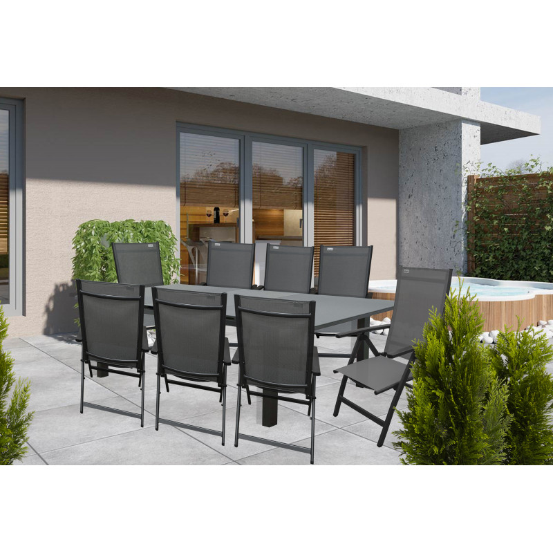 Praktický zahradní hliníkový stůl je nadčasový zahradní nábytek. Antracitová barva a jednoduché, čisté linie jsou vhodné do každého prostředí. Celý stůl je vyroben z vysoce kvalitní hliníkové slitiny, deska stolu je z šedého strukturovaného skla.