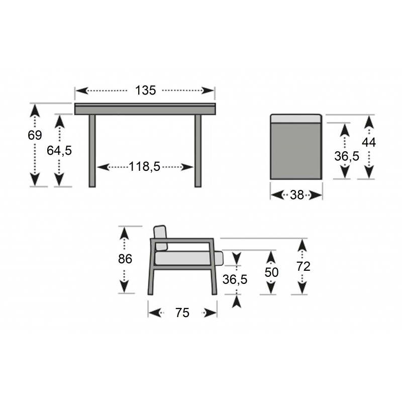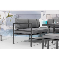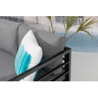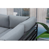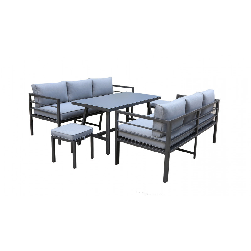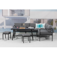 Pohovka a taburety jsou vyrobeny z odolného a lehkého hliníku. Sestava je dodávána včetně nadýchaných šedých polstrů z kvalitního polyesteru, potahy jsou snímatelné a pratelné.