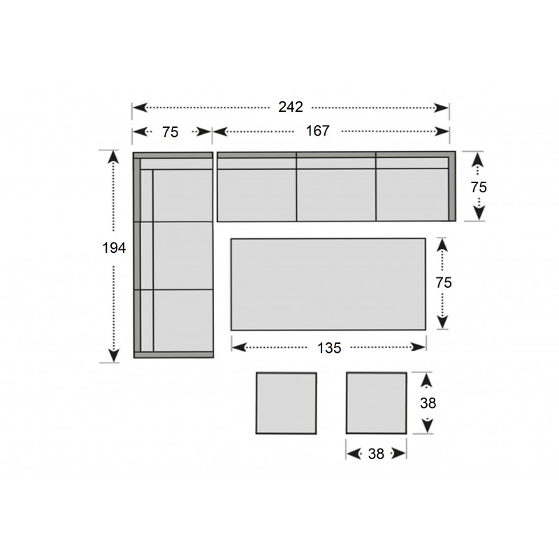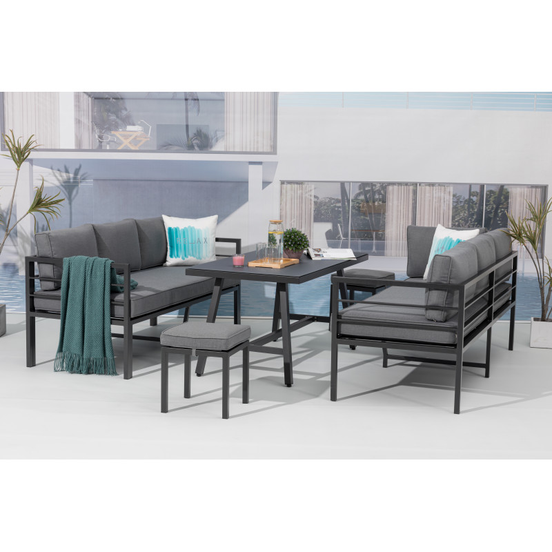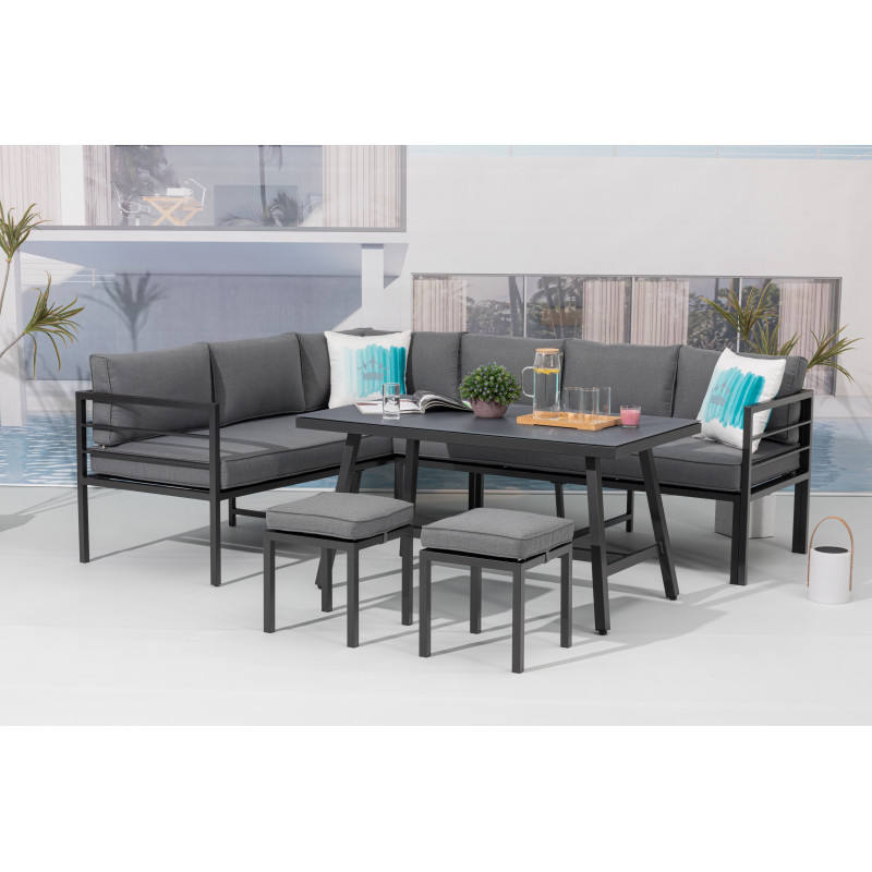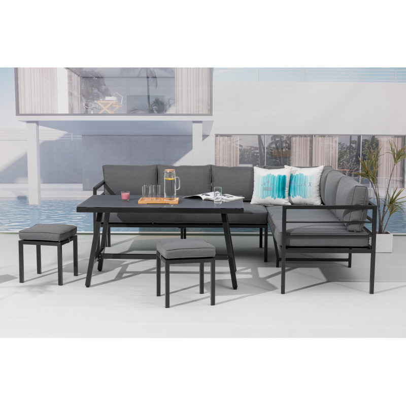 Rohová prostorná zahradní sestava obsahující 8 míst k sezení (2 x 3místná pohovka a 2 taburety) a stůl. Sestava je bezúdržbová a ideální na každou větší terasu na posezení s menší partou přátel nebo rodiny, je variabilní s možností obrácení stran nebo oddělení pohovek od sebe.