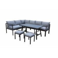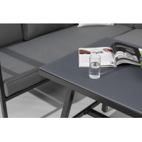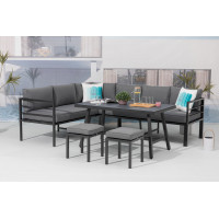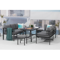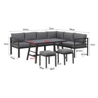 Rohová prostorná zahradní sestava obsahující 8 míst k sezení (2 x 3 místná pohovka a 2 taburety) a stůl. Sestava je bezúdržbová a ideální na každou větší terasu na posezení s menší partou přátel nebo rodiny, je variabilní s možností obrácení stran nebo rozdělení pohovky. Pohovka a taburety jsou vyrobeny z odolného a lehkého hliníku. Sestava je dodávána...
