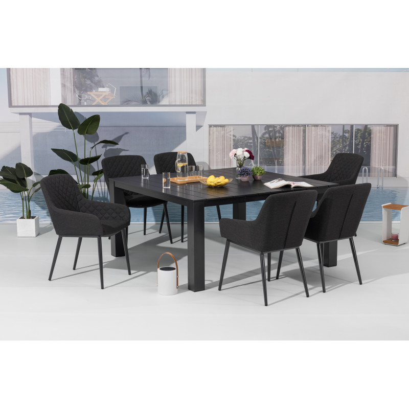 Moderní velký čtvercový zahradní jídelní stůl nadčasového designu se stabilní hliníkovou konstrukcí v antracitové barvě. Stůl je vhodný pro větší plochy teras nebo zahrádek. Deska stolu je hliníková žebrovaná. Stůl je robustní a zároveň lehký a stabilní.