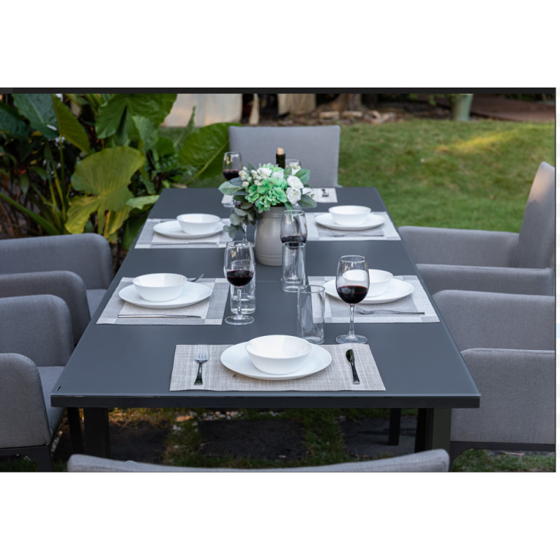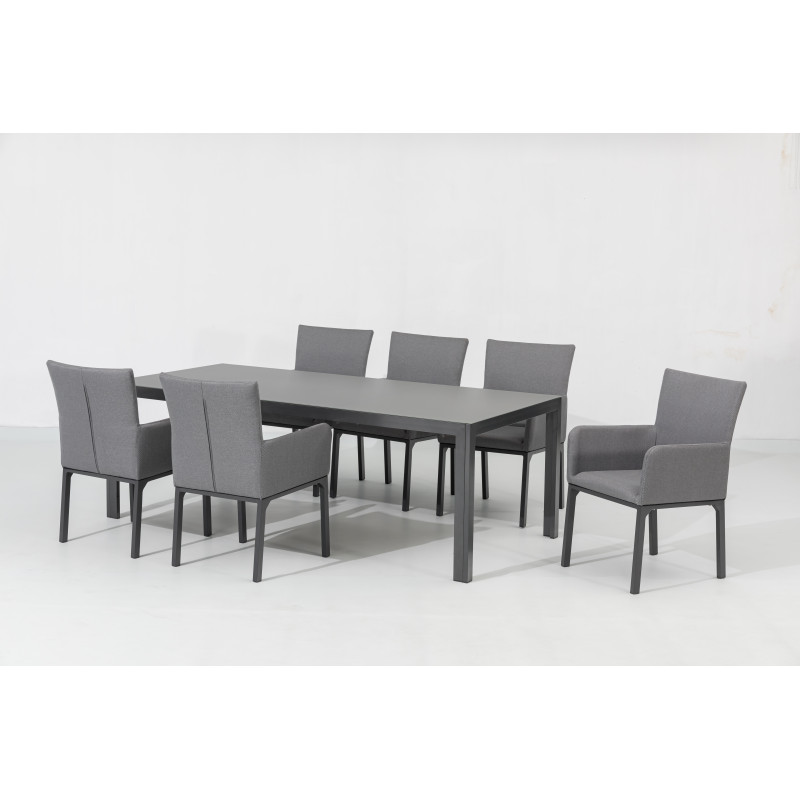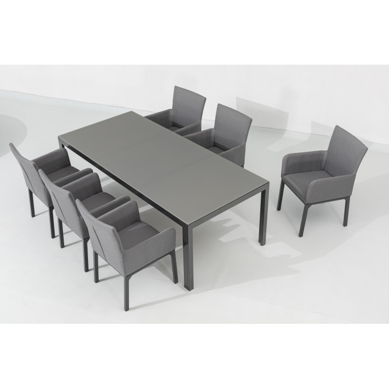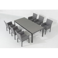 Tato luxusní souprava je vhodná pro každého, kdo hledá elegantní nábytek s mimořádnou odolností vůči nepřízni počasí. Sestava se skládá z 8 polstrovaných křesel a velkého hliníkového čtvercového stolu.