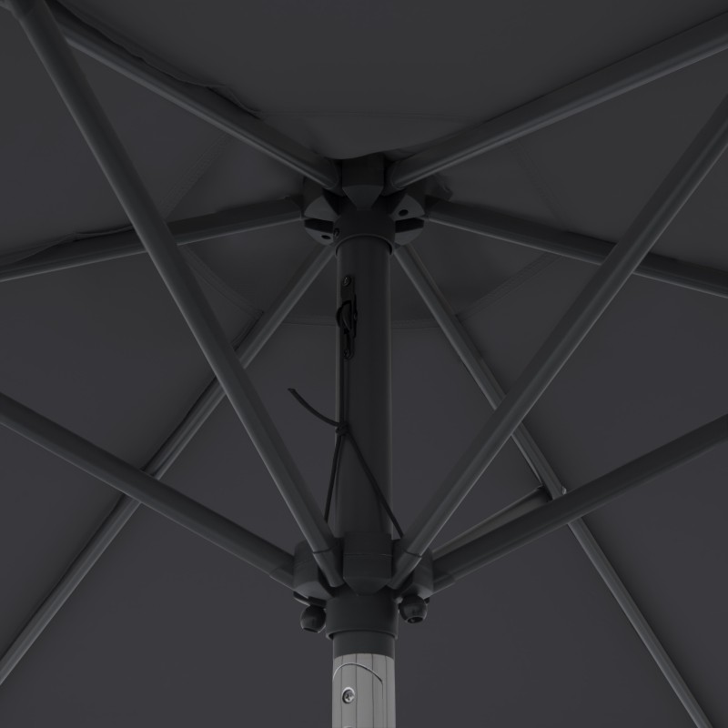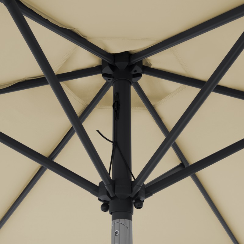 Potah je vyroben ze 100% polyesterové tkaniny, která je odolná vůči povětrnostním vlivům, má vysokou světelnou stálost a poskytuje účinnou UV ochranu 50+. Slunečník má robustní a masivní konstrukci, která zajišťuje jeho dlouhou životnost a stabilitu.