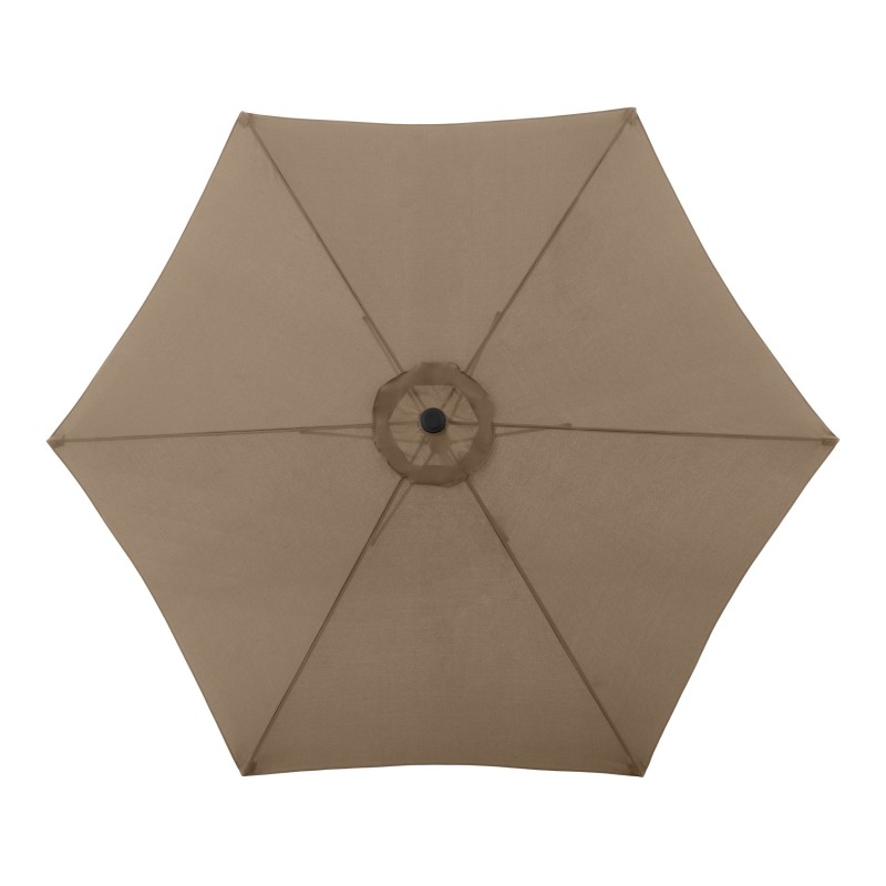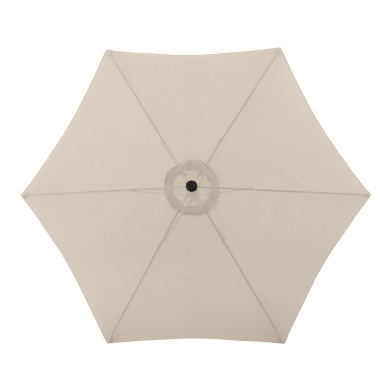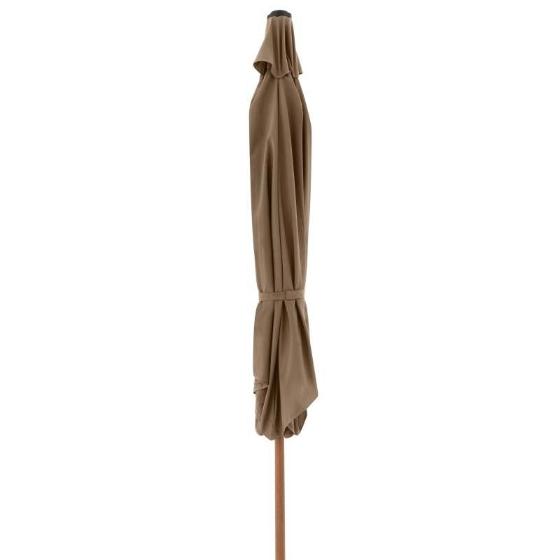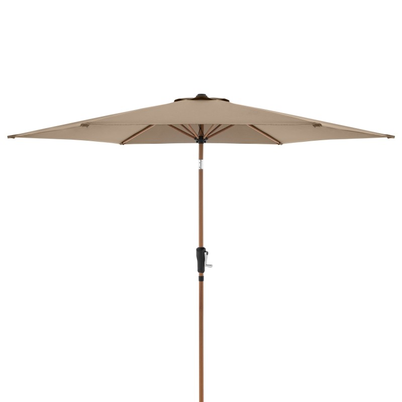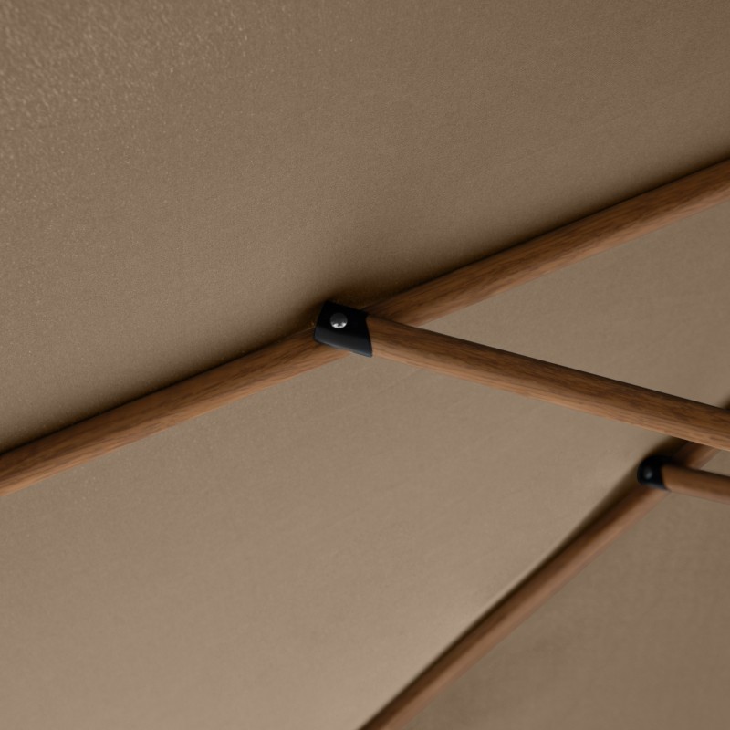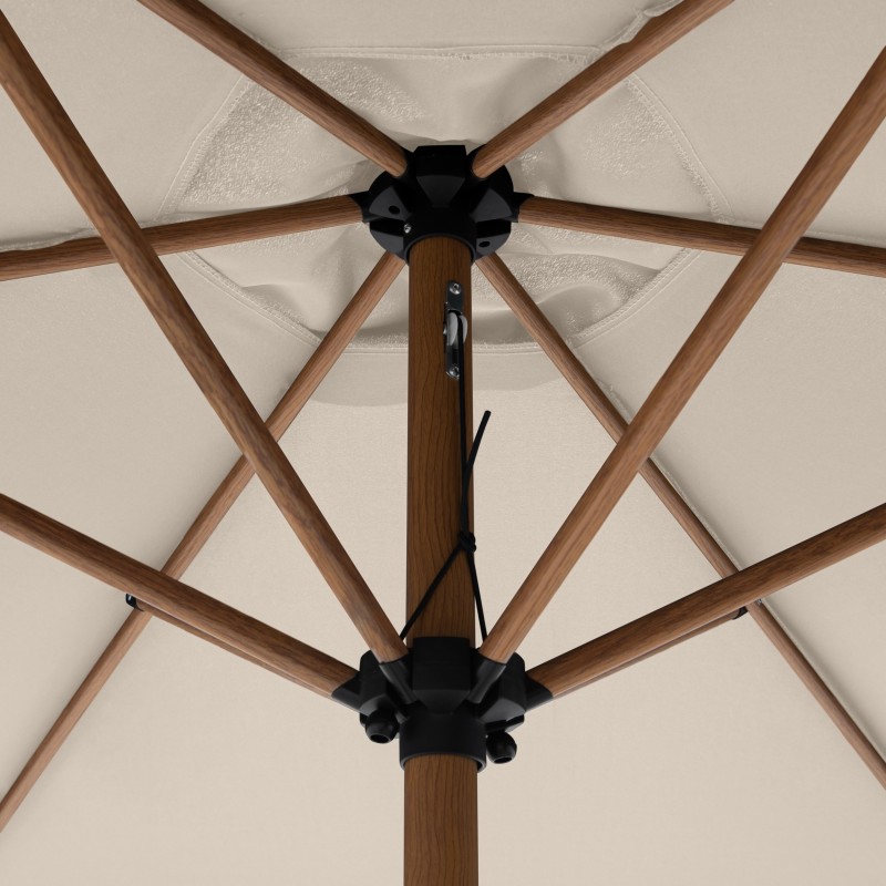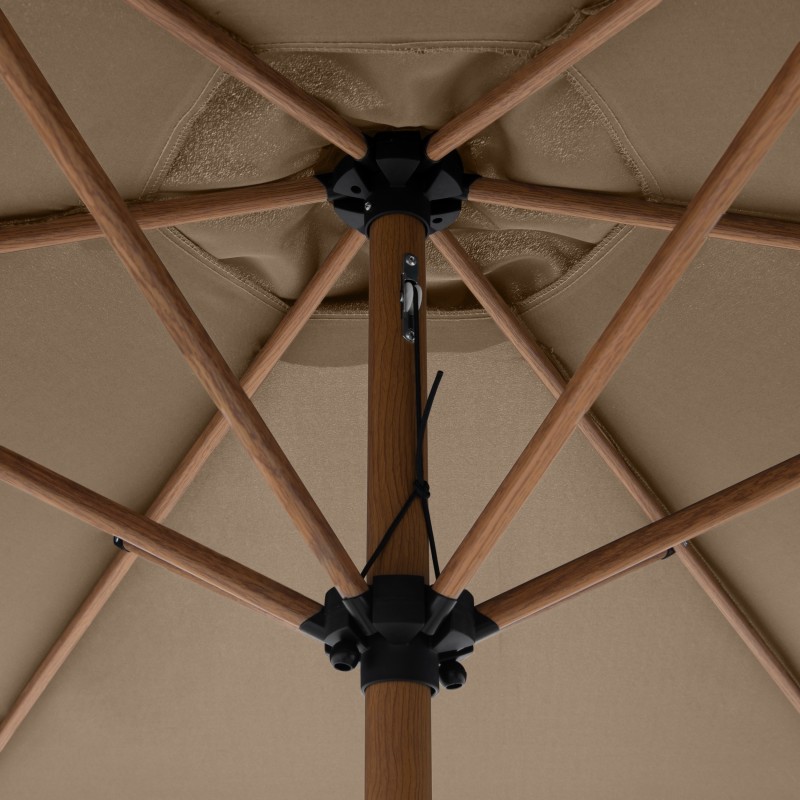 Potah je vyroben ze 100% polyesterové tkaniny, která je odolná vůči povětrnostním vlivům, má vysokou světelnou stálost a poskytuje účinnou UV ochranu 50+. Slunečník má robustní a masivní hliníkovou konstrukci v imitaci dřeva, která zajišťuje jeho dlouhou životnost a stabilitu.