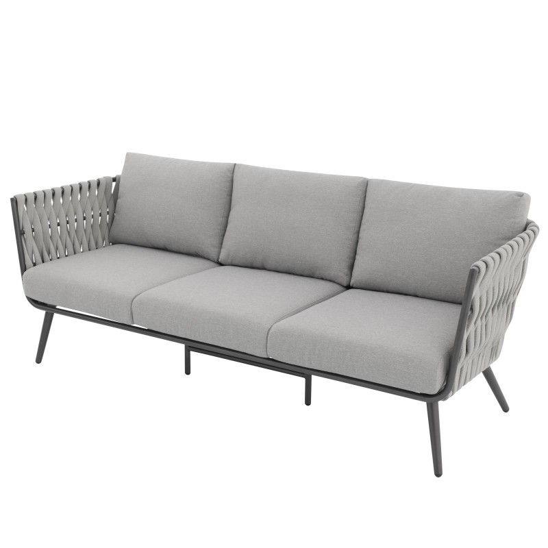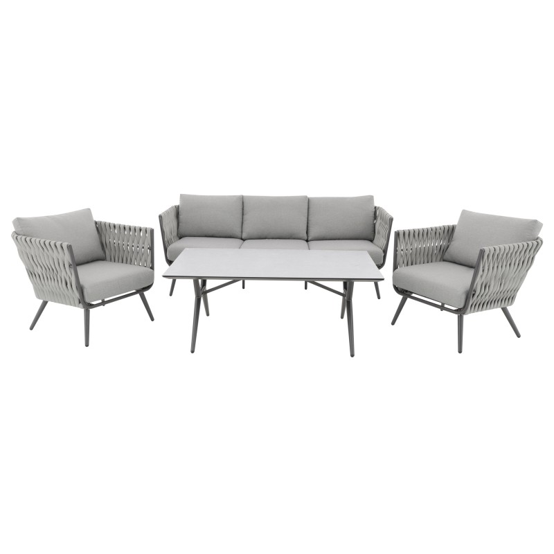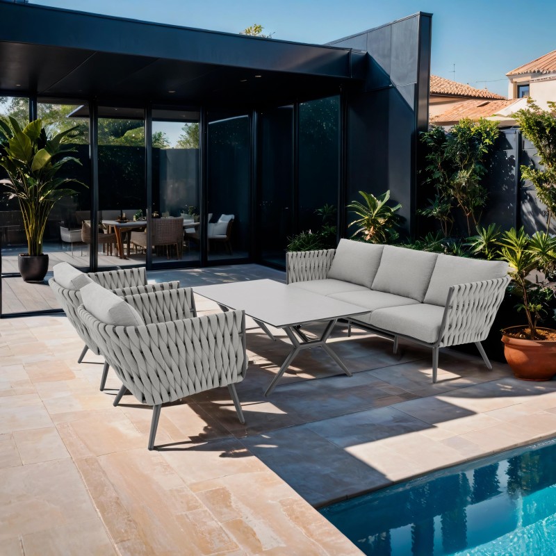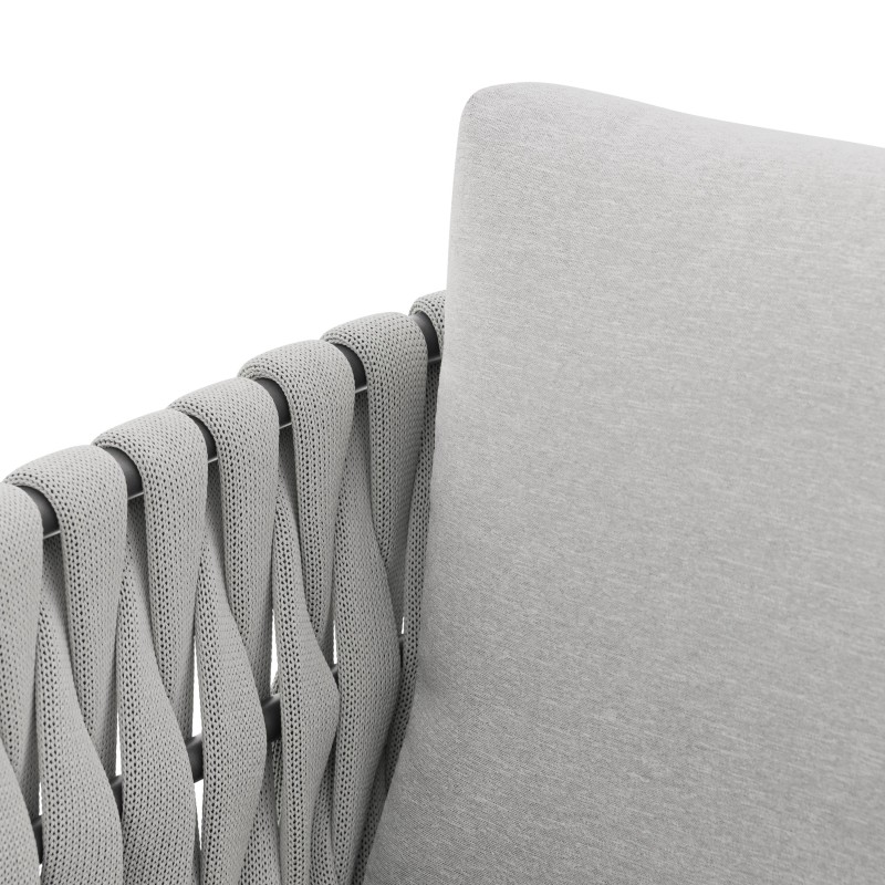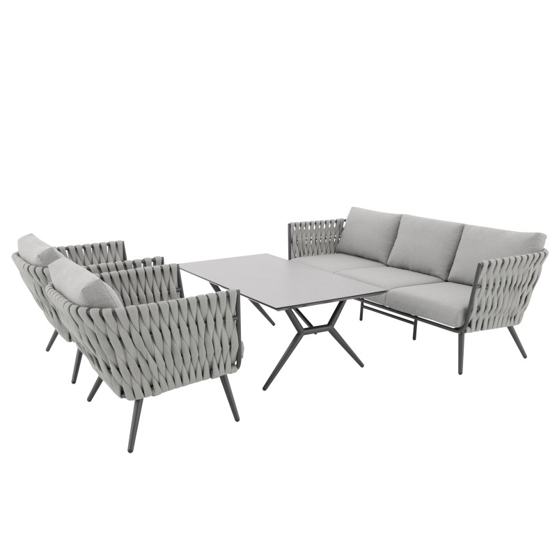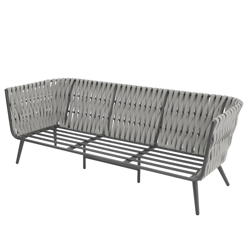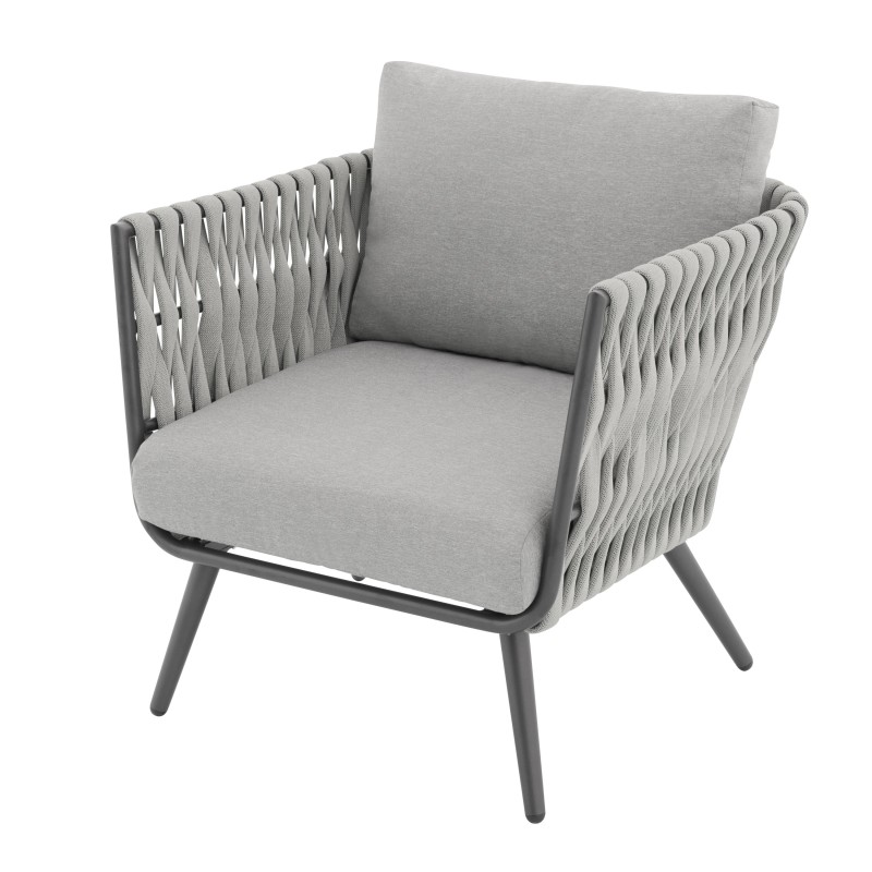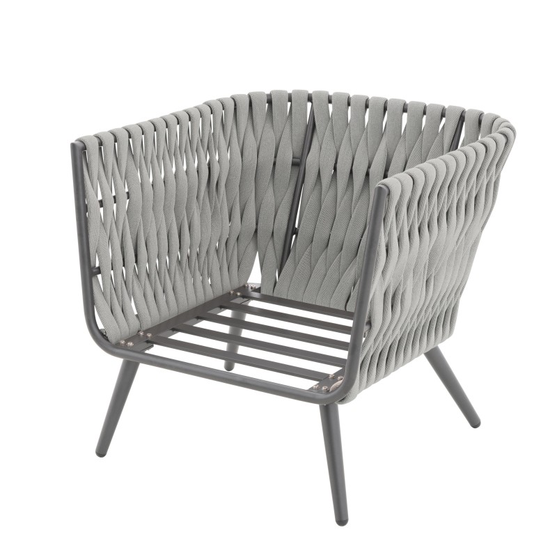 Pevná hliníková konstrukce s moderním práškovým nástřikem v antracitové barvě dodává sestavě nejen robustnost, ale i nadčasový vzhled, který se hodí do každého exteriéru i interiéru. Provazový výplet na opěrkách a područkách zajišťuje atraktivní design a pohodlí, které oceníte při každém posezení.