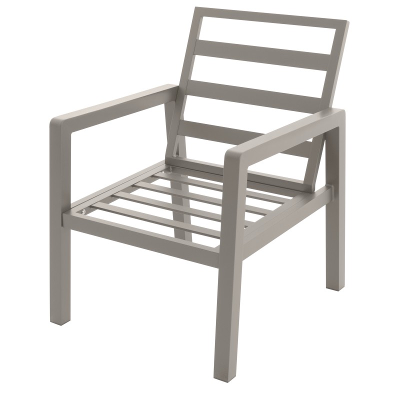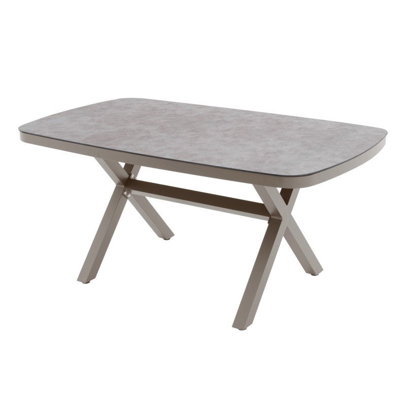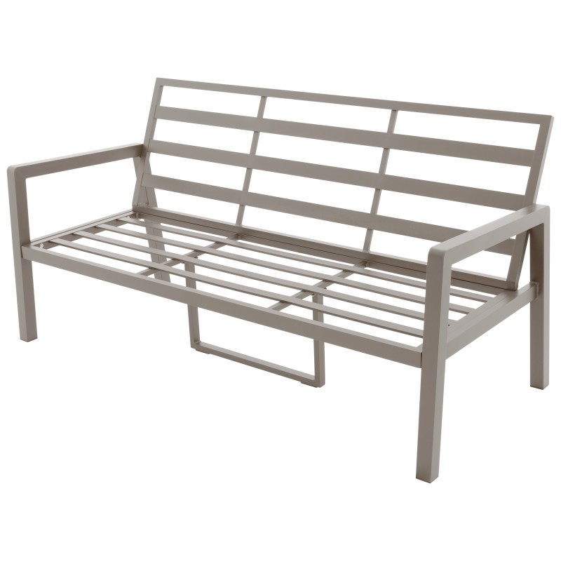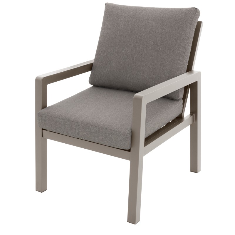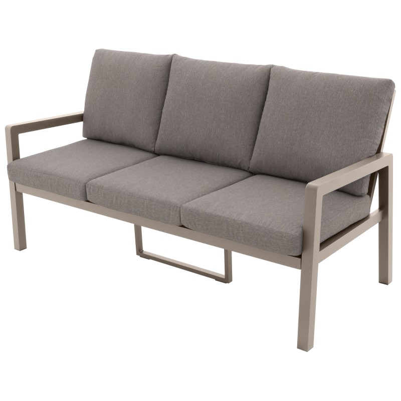 Konstrukce z odolného hliníku v pískovém odstínu působí jemně a nadčasově, zatímco polstry v barvě mocca dodávají sestavě útulný a přirozený vzhled. Materiály jsou odolné, snadno se udržují a zaručují dlouhou životnost i při venkovním používání.