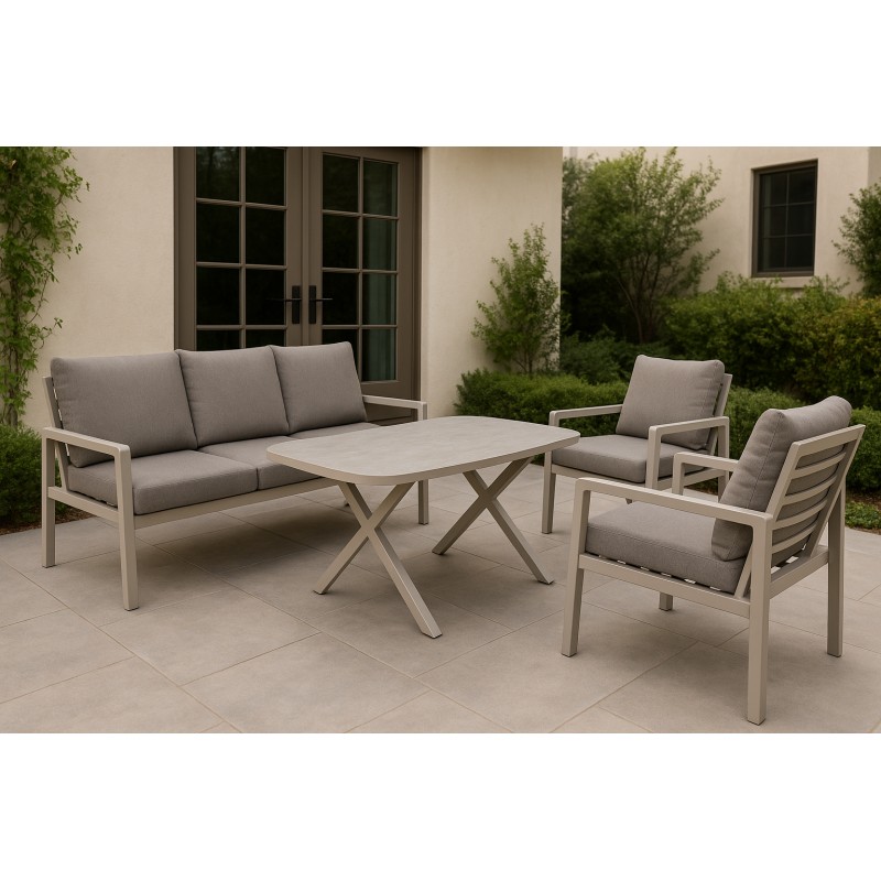 Vytvořte si na své terase či zahradě místo, kde se snoubí komfort s moderním designem. Tato elegantní sestava obsahuje třímístnou pohovku, dvě pohodlná křesla a stůl s keramickou deskou v krémové barvě o síle 5 mm.