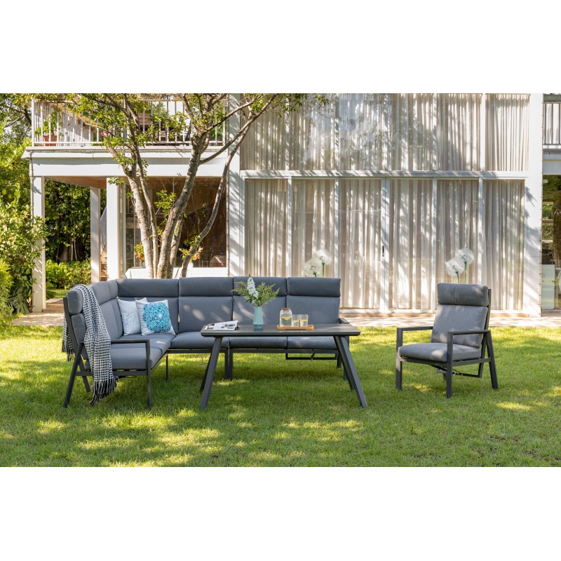 Měkké, nadýchané polstry v šedé barvě mají potahy ze 100% polyesteru, který je odolný vůči oděru, slunečnímu záření i vlhkosti. Potahy jsou snímatelné a pratelné, takže udržení sestavy v perfektním stavu je snadné.