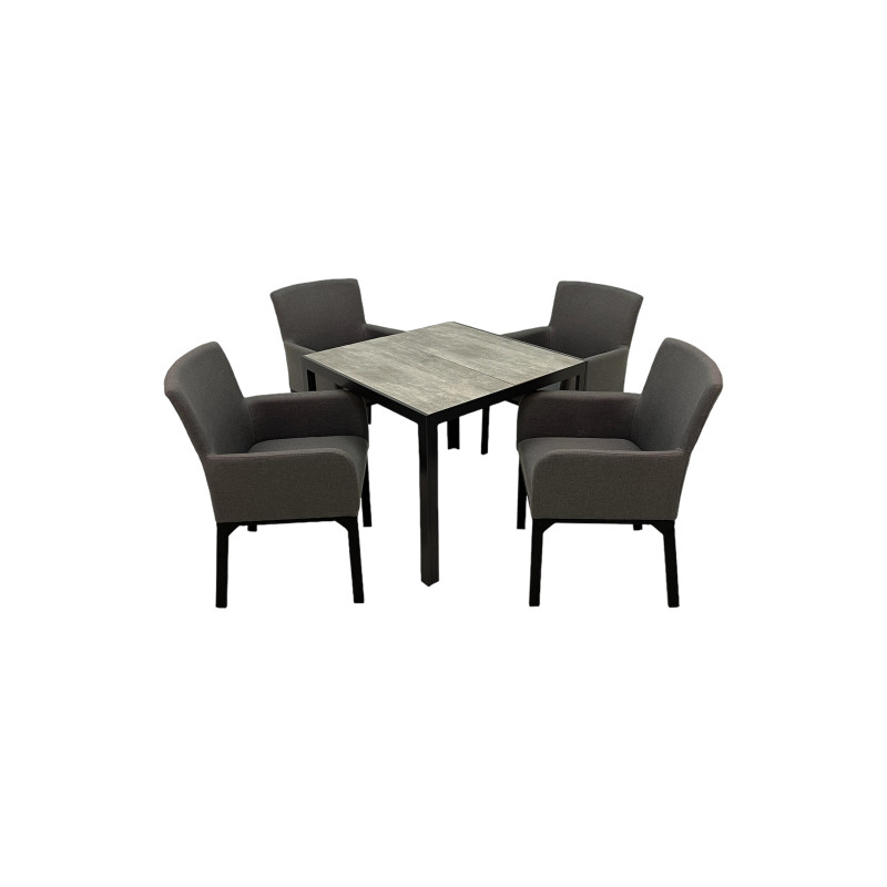 Skládá se ze 4 designových křesel TOMBOLO se stabilní hliníkovou konstrukcí v antracitové barvě. Moderní polstrované křeslo z látky Olefin v šedé barvě je novinkou letošního roku a rozšiřuje řadu celopolstrovaných jídelních křesel z odolných materiálů. Materiál Olefin je syntetická tkanina s vynikajícími vlastnostmi pro venkovní použití, vhodná i do zátěžových provozů. Vlastnosti: odolnost vůči otěru, odolnost v tahu, vysoká světlostálost, příjemná na omak, odolná vůči skvrnám, odpuzuje nečistoty a je rychleschnoucí. Výplň křesla je rychleschnoucí pěna. Konstrukce je velmi lehká přesto bytelná a pevná.