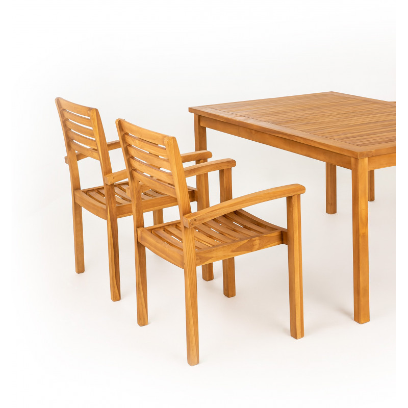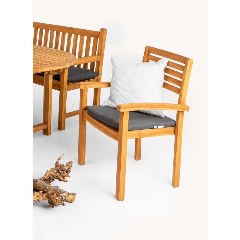 Stohovací křeslo Taman je vyrobeno z kvalitního vysušeného teakového dřeva, které je mimořádně odolné, vysoce trvanlivé a pevné. Laťový sedák, pevné područky i tvar opěrky křesla jsou navrženy tak, aby křeslo bylo co nejpohodlnější a aby co nejlépe podepíralo jednotlivé části těla. Křeslo je masivní, přesto skladné díky stohovacímu systému. Spoje a kování jsou z nerezavějícího materiálu.